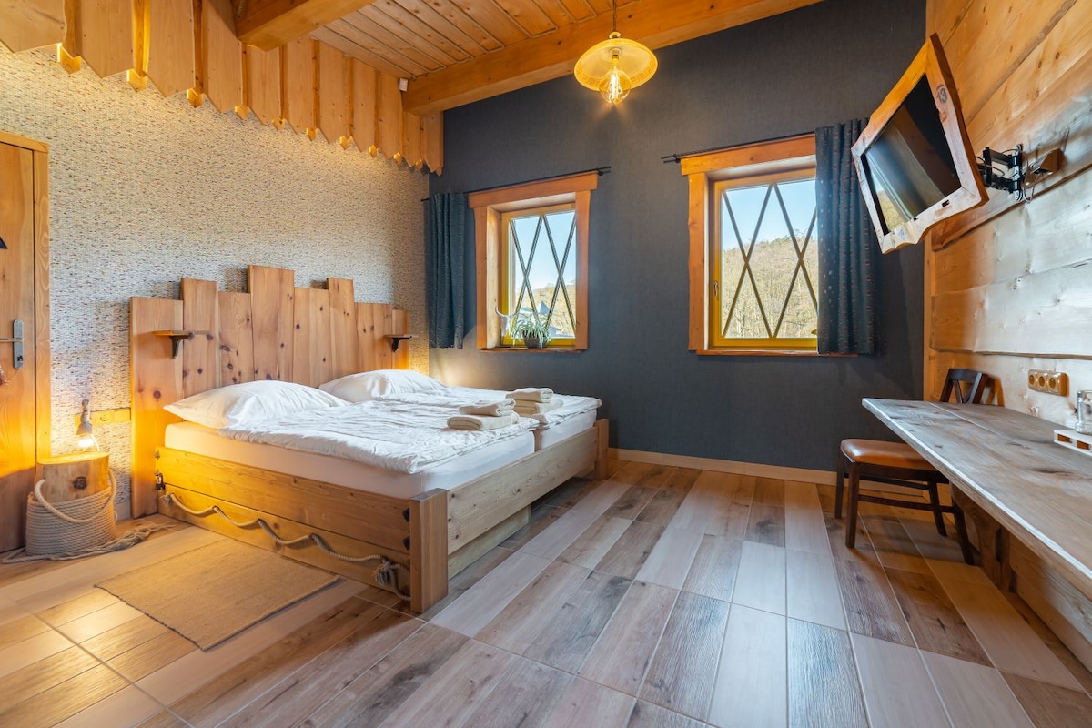 Táto dvojlôžková izba, nazývaná Room Rider Engi, sa nachádza na prízemí a je možné do nej pridať výsuvnú prístelku, čo poskytuje väčší komfort a flexibilitu pre našich hostí.