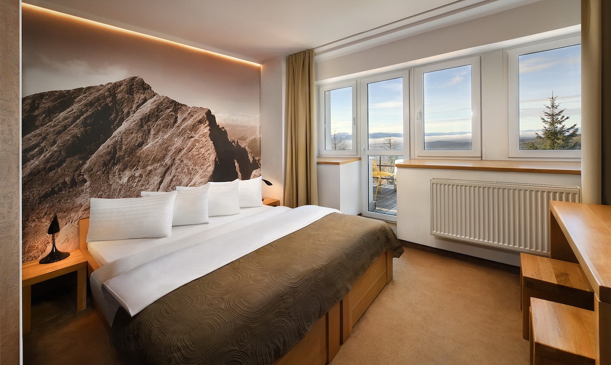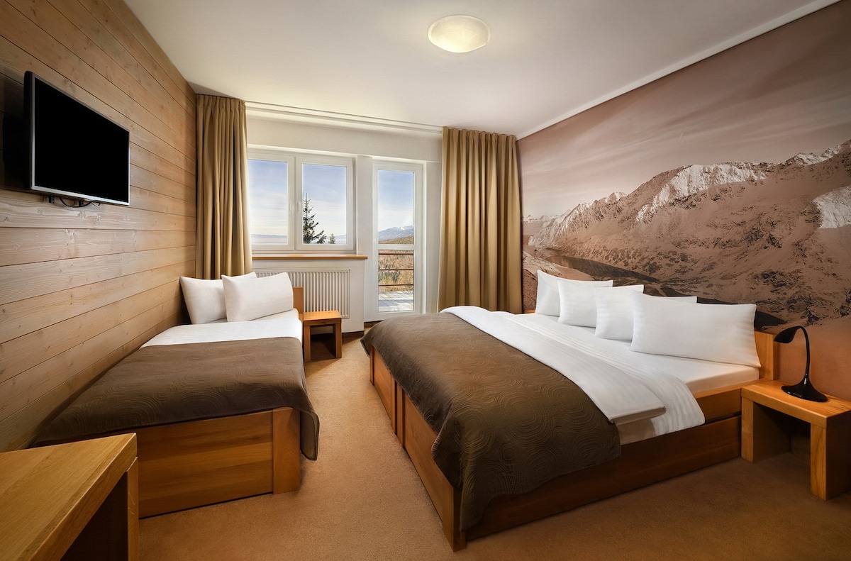 Moderne zariadená dvojlôžková izba s vlastnou kúpeľňou a televíziou, ktorá sa nachádza priamo v Chate pod Soliskom s výhľadom na Kriváň. Vybavenie izby: jedna manželská posteľ posteľná bielizeň TV WiFi osuška, uterák kúpeľňa s toaletou a sprchovacím kútom sušič vlasov V cene ubytovania: 1 parkovacie miesto pri nástupnej stanici lanovky na Solisko Priestory a služby: reštaurácia á la carte raňajky (za doplatok)