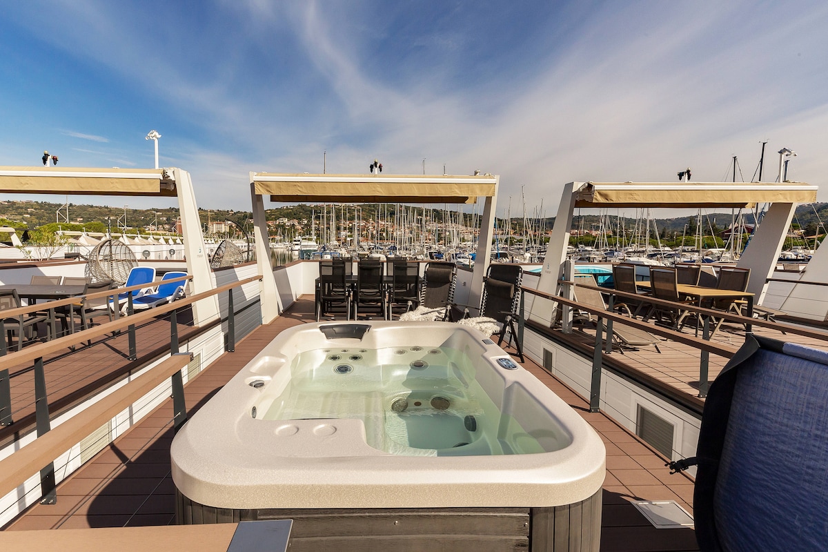 Experience the air-conditioned floating house Miramare, hosting up to 6 guests. Let yourself be swept away by the tranquil rhythm of life on the sea. The house includes a fully equipped kitchen, a cozy living area with a sofa bed and dining table, two bedrooms, and a bathroom. Step onto the terrace, where outdoor furniture, sun loungers & a hot tub await, all against the backdrop of an enchanting sea view. Your stay is complete with provided linens, towels, LCD TV & free WiFi. Warmly welcome!