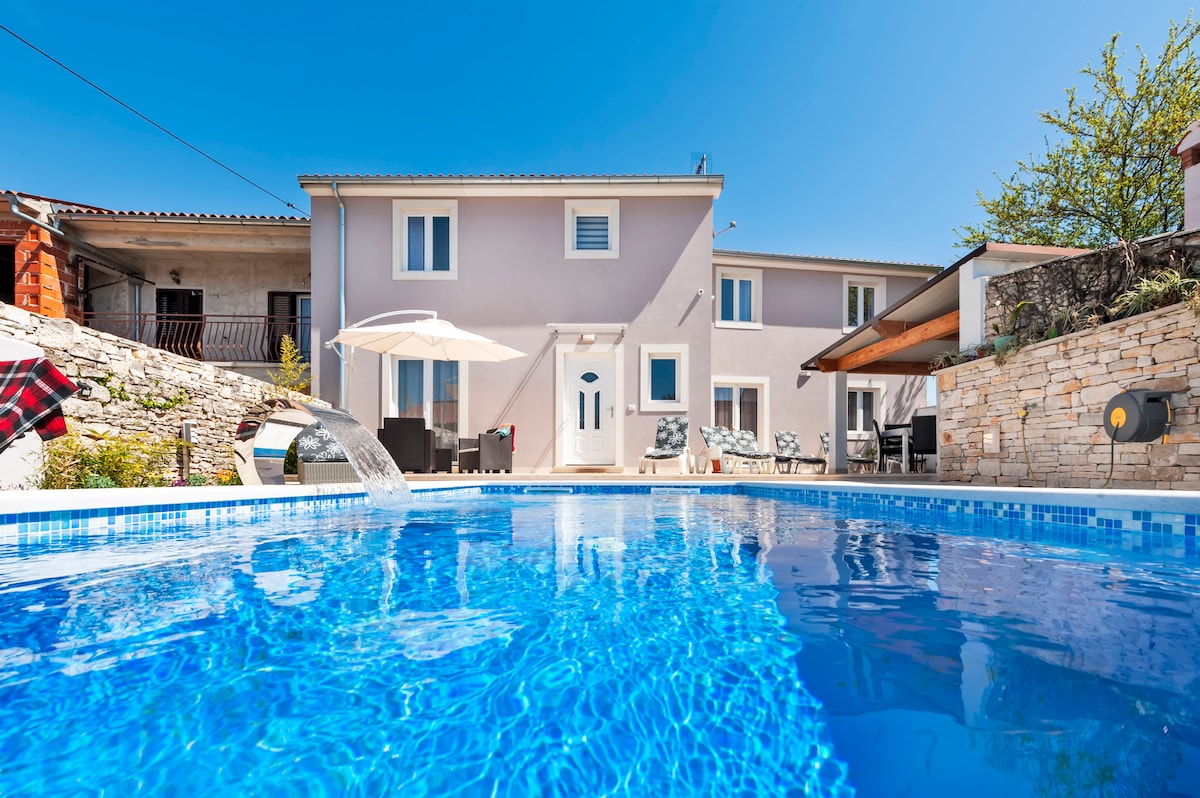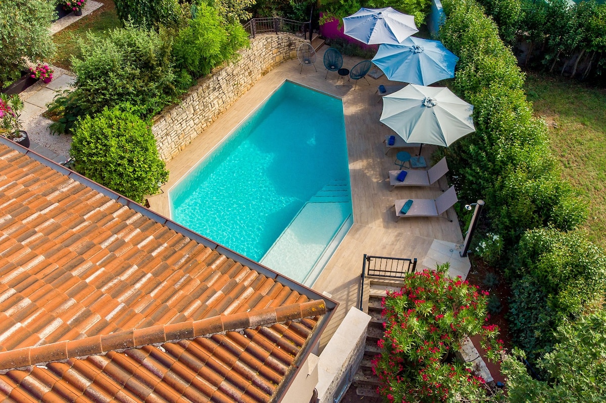 The One-Bedroom Vacation Home (semi-detached house) accommodates up to 4 people (2+2). It is located in a typical Istrian village with breathtaking views of Motovun and Central Istria green oasis. The house has a private heated swimming pool, air condition (cooling and heating), free wi-fi, smart cable tv, private parking and is a short drive away from all the main tourist and historic attractions of Istria. Since 2024, the house has its own power plant, so it is energy self - sustaining.