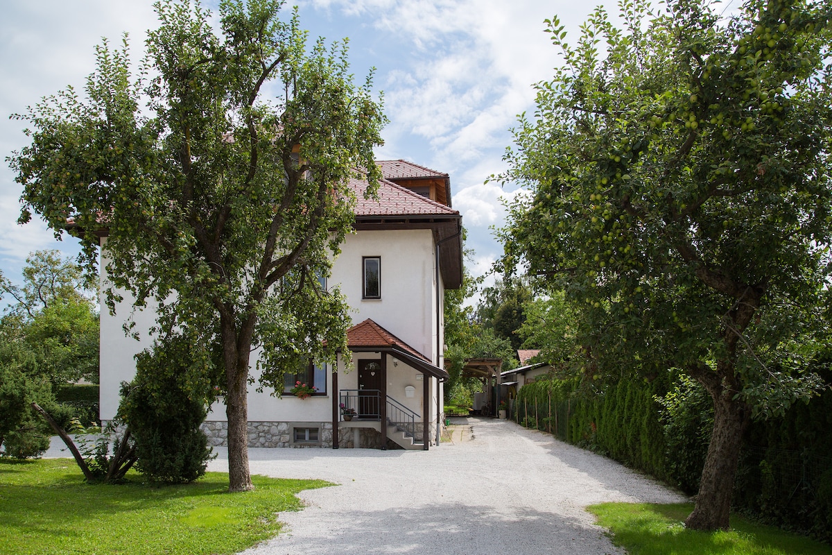 Charming apartment is located in the center of Bled, in an old renovated villa from 1950s, within 10 minutes walk from lake Bled and two minutes walk to first supermarket and bakery. The apartment has a private terrace and private bathroom, fully equipped kitchen and sleeps five. It displays lots of antiq wooden art, paintings and old postcards that were found in the villa. Welcomes families, friends and couples.