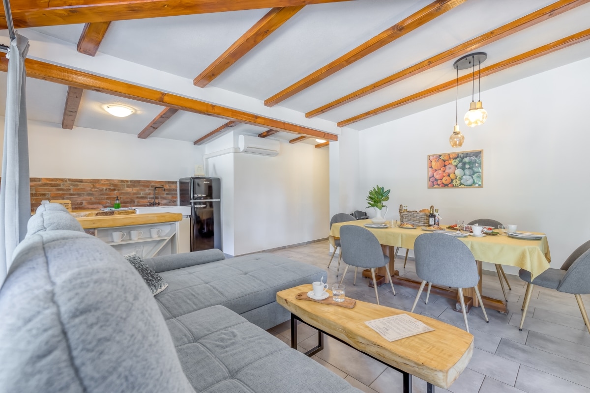 Lookout Resort is a family house with three apartments and a garden. On the ground floor there is a shared washing and drying area, a relaxation area with a cinema and a sauna. In the garden there is also an additional summer kitchen and a pavilion with a barbecue. E-bikes can also be rented. Lookout apartment Galeta on the first floor has bedroom (2 guests), an additional room (2 guests), a living room (2 guests), a bathroom, a toilet, a kitchen and a balconie.