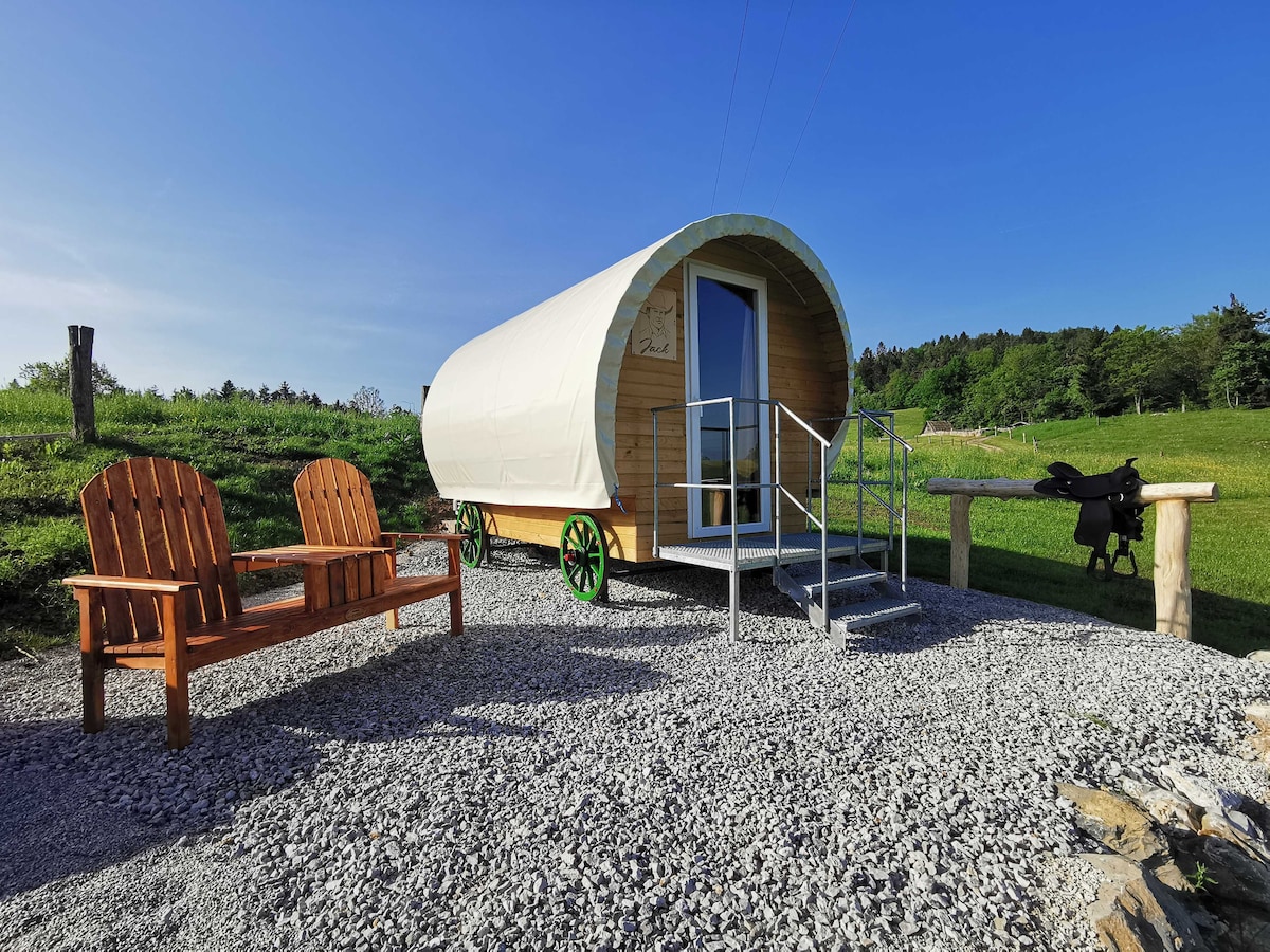Visit us in a charming wooden glamping in Davča near Škofja Loka, which is part of a lovely glamping. We can host up to 2 people and is a great experience for couples, and friends. Located just above Železniki, with a stunning panoramic view, combines modern comfort with rustic charm. The terrace, a green garden, meadows, and lakes invite you to socialize outdoors, which is why it is an ideal authentic spot for experiences and creating memories in one of the most pristine places in Slovenia.