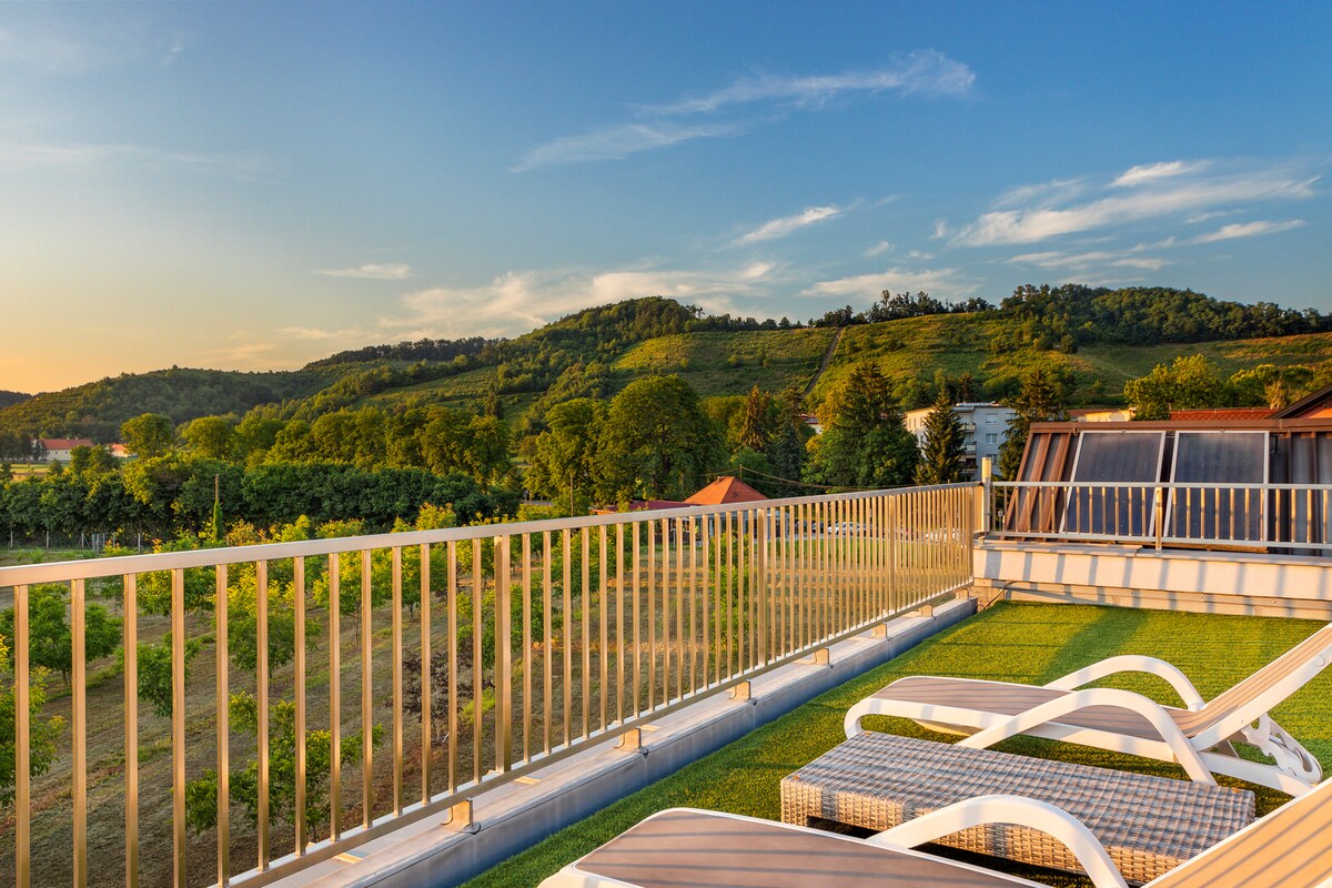 Charming Home in Rogaska Slatina a famous spa resort renowned for healing water! 5 Minutes drive to Janina local ski resort. 50km from Rogla, popular ski Resorts! Spread over 2 floors. 2 doubles, Views of Boc Mountain from large balcony. Fully equipped kitchen with open plan dining/Living area double sofa-bed, digital TV/Wifi. Stylish decor. Outdoor Patio with gas BBQ, free parking. 5 min walk to local shops, 5 min drive to Spas, Ski Slope/Tennis. 1hr to Zagreb /1hr30 Ljubljana Airports.