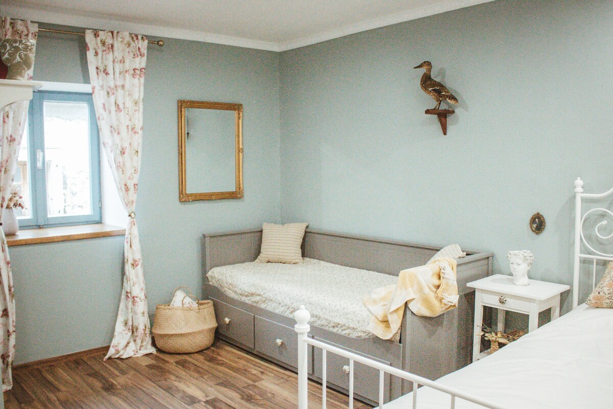 Country house Oberfeld is a beautiful luxury equiped apartment in countryside 2 km from pretty Vipava city containing a well-restored 18th-century farmhouse. Rooms are new in old fashioned style with a lot of space (each room approx. 20 m2). Big kitchen with oven, dish washing machine, refrigerator, coffe machine, toaster, etc. Middle size bathroom. Free private parking is on site (garage) or very close by.