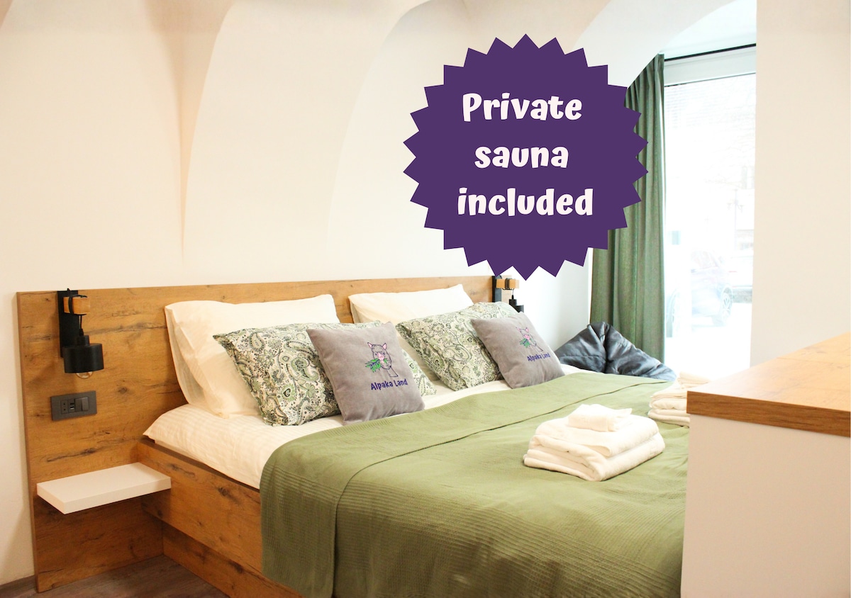 Forget your worries in this spacious and serene APT for 6 person that has: ➤ private infrared sauna & jacuzzi (available to guests without restriction and additional cost) ➤ free private parking ➤ luxurious spring box bed in bedrooms ➤ view from the terrace to nearby hills ➤ free storage of bicycles and skis ➤ free electric bicycles charger ➤ washing machine and dryer in the unite ➤ shower with massage panel