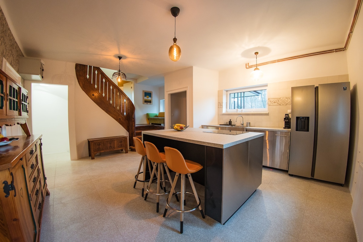 Sunflower House is a cozy, completely detached house in the countryside, surrounded by forests and meadows. It is designed for a peaceful getaway for up to 12 people, and includes a private sauna, seasonal jacuzzi, terrace, children's play area and a fully equipped kitchen. Ideal for families and small groups who appreciate nature and privacy. Pets are not allowed.
