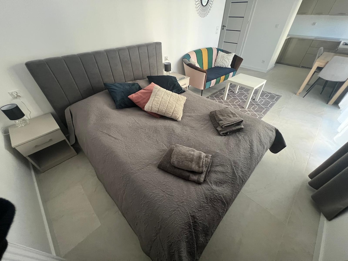 Nowoczesny apartament zlokalizowany w ścisłym centrum miasta Słupsk. Składa się z salonu z aneksem kuchennym oraz wyspą, sypialni z przestronnym balkonem, kuchni, korytarza oraz łazienki z prysznicem i pralką.W sypialni znajduje się podwójne łóżko, a w salonie rozkładana sofa narożna. Kuchnia jest w pełni wyposażona. Do dyspozycji gości pozostaje m.in. papier toaletowy, mydło, ręczniki oraz pościel. Dostępny jest parking na ulicy z przodu budynku, lub parking dla mieszkańców na tyłach budynku.
