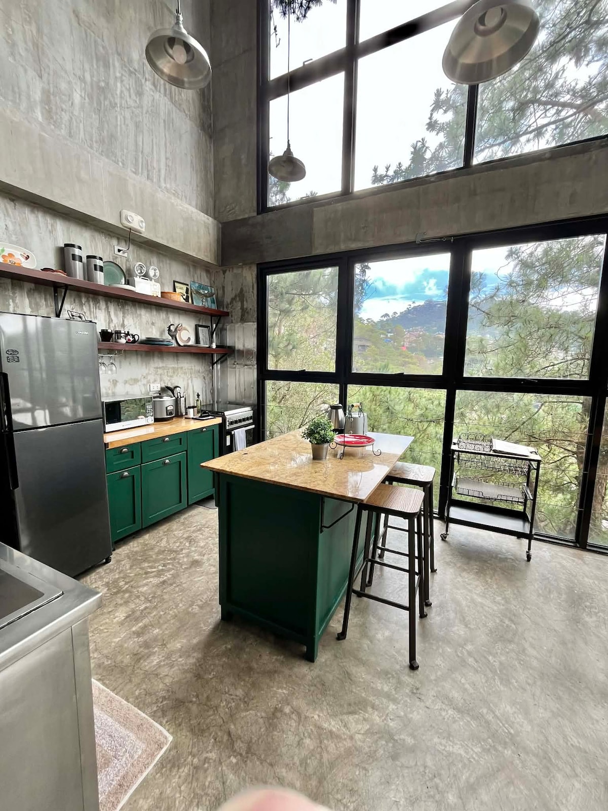 Just 3.5 kms from city center but tucked away in a lush, very fresh environment. Enjoy clean cold mountain air, sweet smell of pine trees, and amazing sight of fog. The industrial rustic design and warm interiors bow to the stunning natural beauty of its surroundings. Large glass walls let in glorious natural light at daytime and astonishing city lights at night. The majestic views from the large roof deck will take your breath away. Baguio Hillhouse is beyond accommodation, it is an experience.