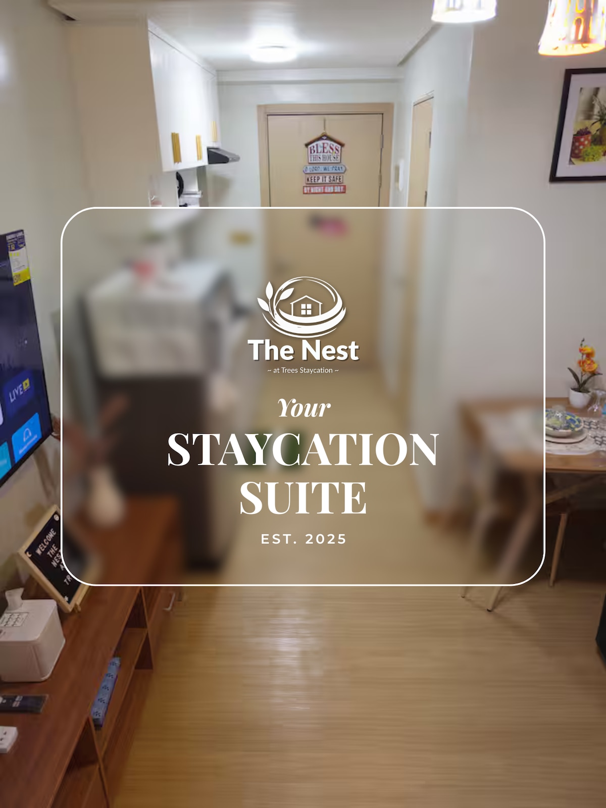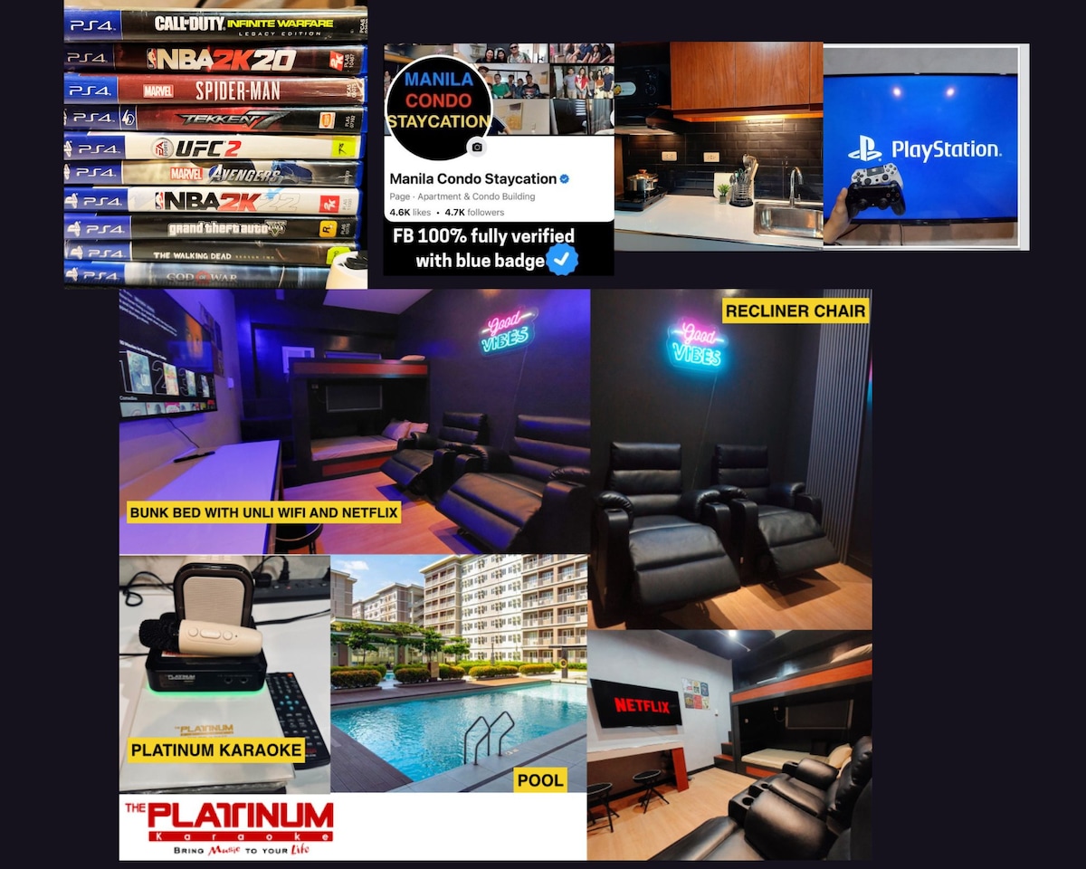 Welcome to Shia Staycation! A serene and stylish retreat within Trees Residences. Minimalist Design: Clean, simple, and elegant space. Entertainment Hub: 55" Smart TV with Netflix, Karaoke and a PS4. Ambiance Lighting: Multi-color lights for any mood. Comfortable Bed: Hotel-grade Double-sized bed for restful sleep. Modern Amenities: High-speed WiFi, fully equipped kitchen, study/computer table. Bathroom Comforts: Water heater with a table top. Ample Storage: Spacious cabinet for organization.