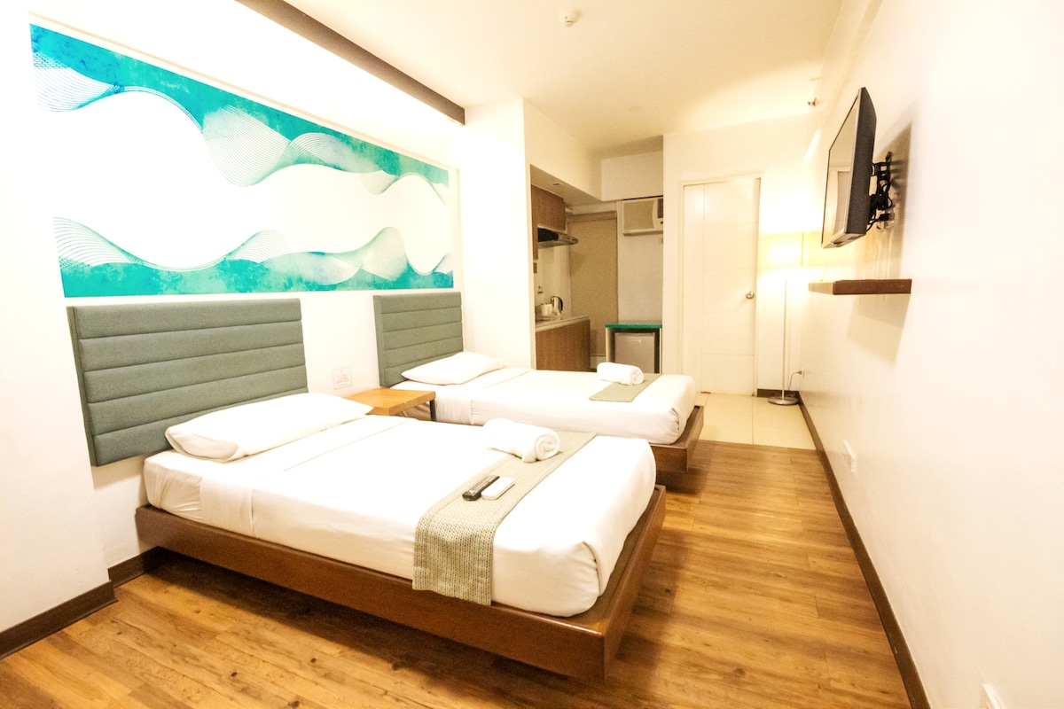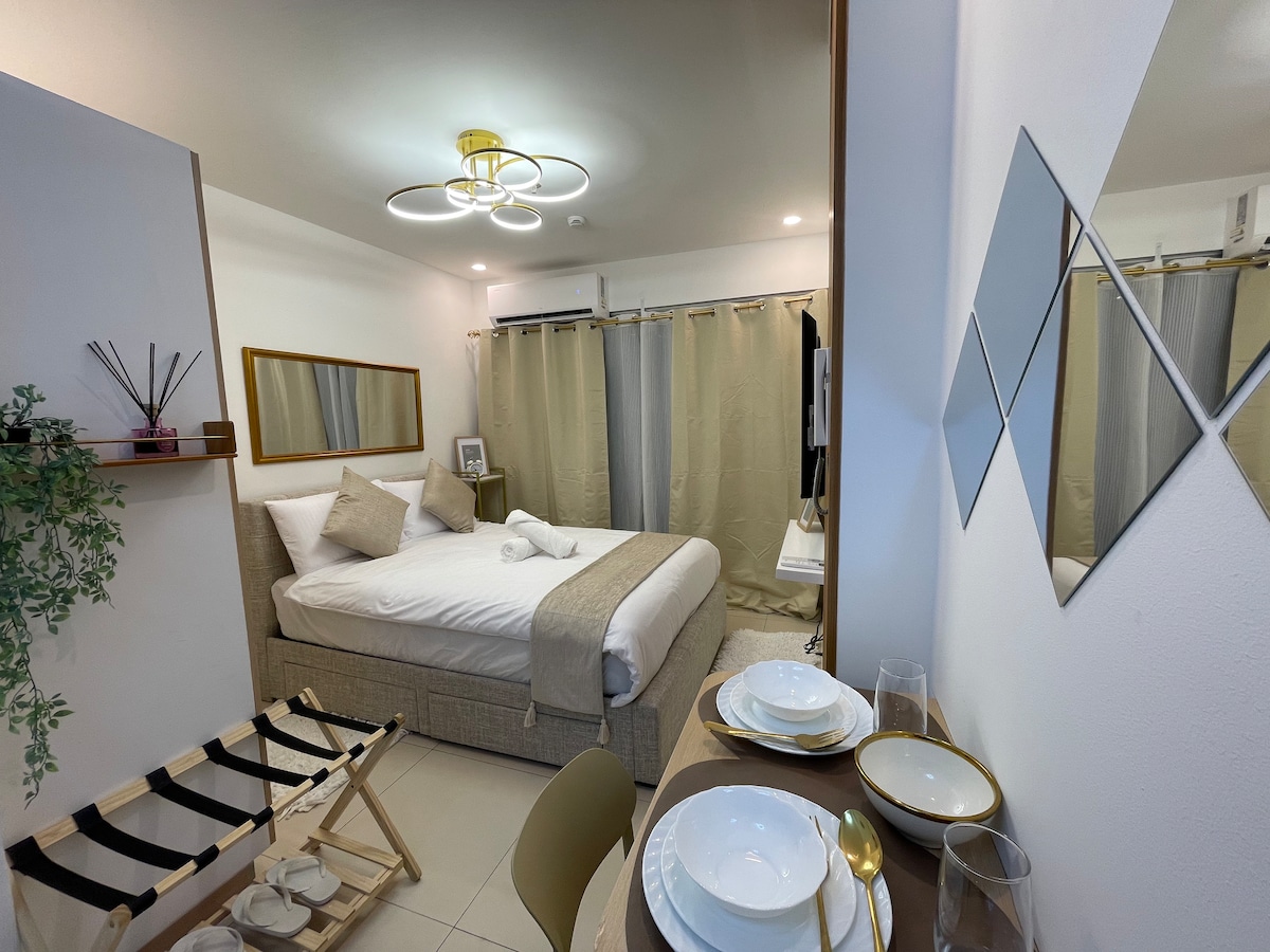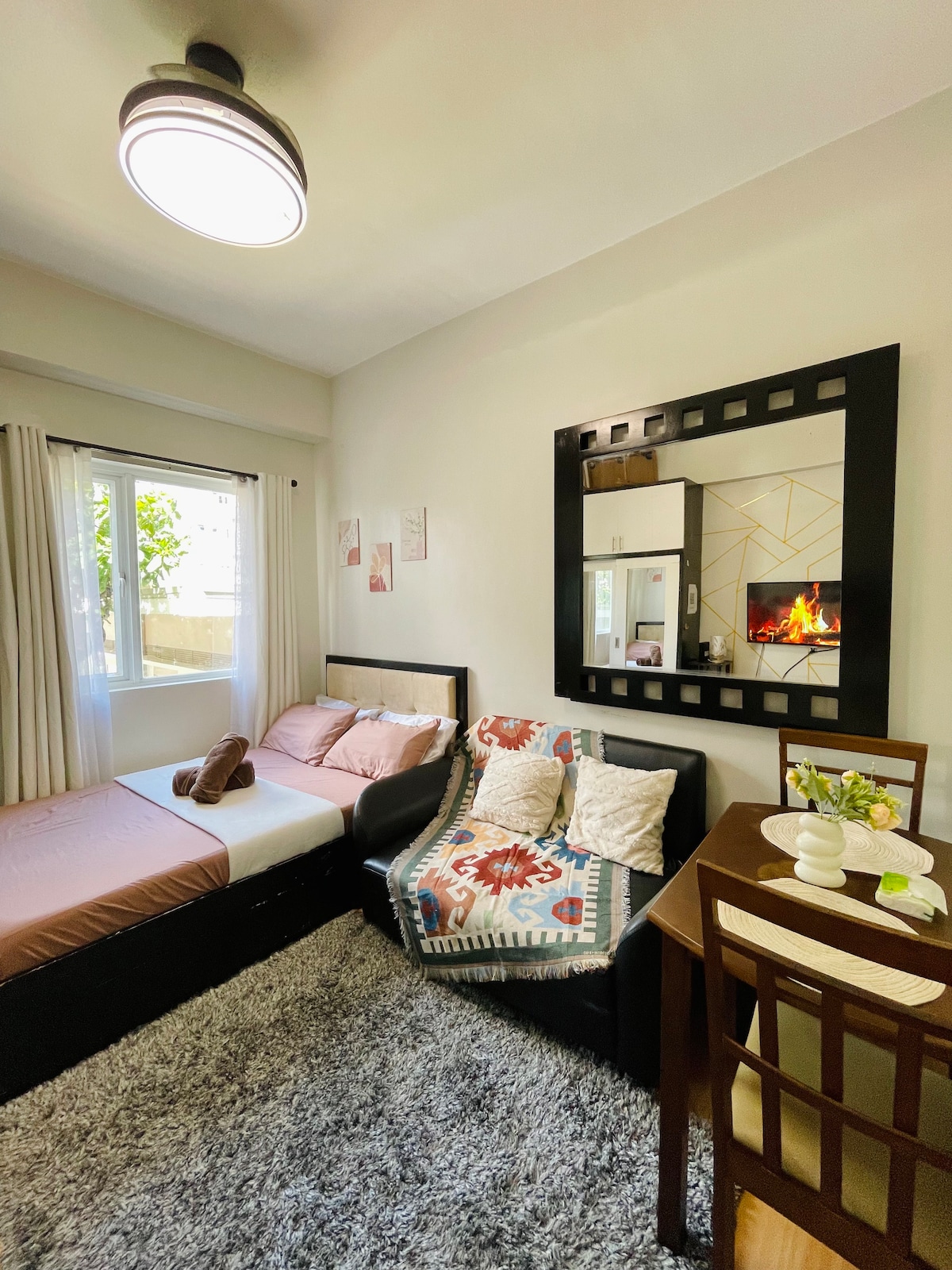 Grass Residences Tower 5 41st floor 1 bedroom with balcony City lights view Check in: 2pm onwards Check out: before 12nn 🛏️ Queen Size Bed 🛏️ Double Size Airbed 📺65" Smart TV with Cable and Netflix 🛋️Sofa 🍽️Dinning table and chairs 🛜100mbps fast internet connection ❄️1.5hp split type aircon 🧑🍳Complete cookwares 🥶2Door Refrigerator ✅Microwave ✅Electric Kettle ✅Rice Cooker ✅Electric Stove ✅Rangehood 🚿Shower Heater 🪞Vanity mirror 🗄️Cabinet Pool ticket 150/head 7am-10pm