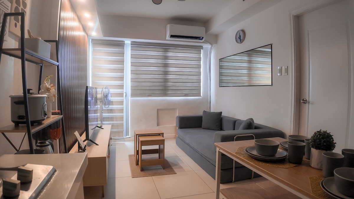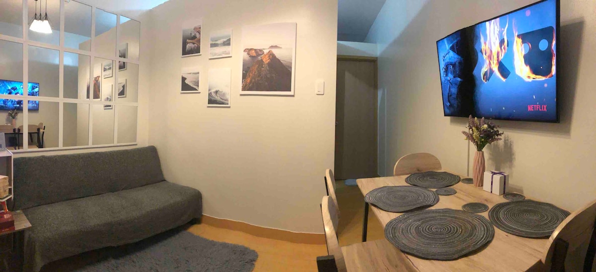 The place is nice and quiet close to the store and mall’s easy access and very convenient place to couple and group to stay. Inclusion ✔Queenbed with pullout bed ✔Pullout Sofa bed ✔55" Smart TV ✔Air-conditioned ✔Infrared Stove ✔Refrigerator ✔Rice Cooker ✔Kettle ✔Microwave ✔Kitchenware ✔Internet ✔Rain shower with Heater ✔Bath towels ✔Tissue ✔️Hair blower ✔️Clothe steamer ✔️Mini videoke ✔️Pay Parking