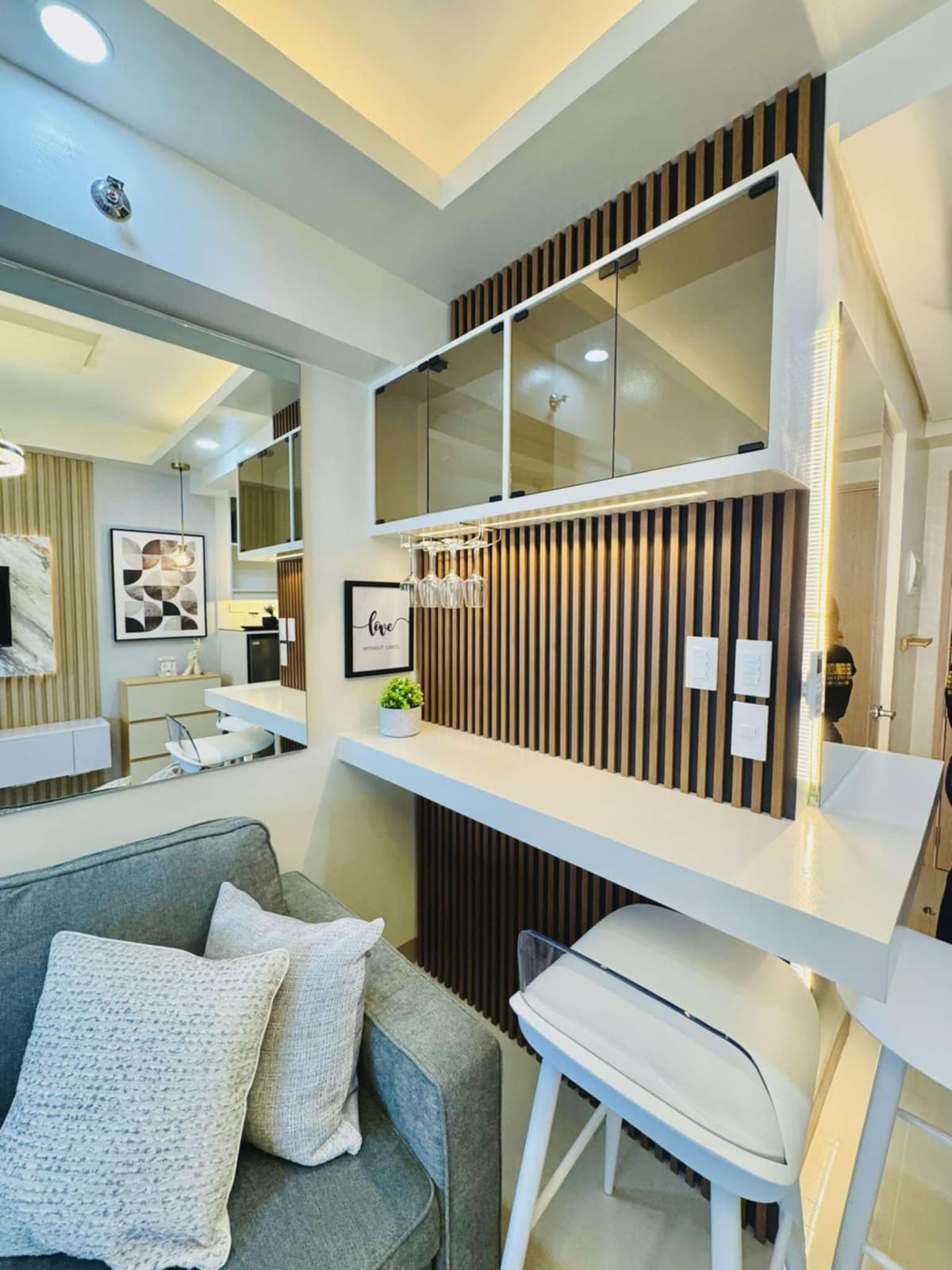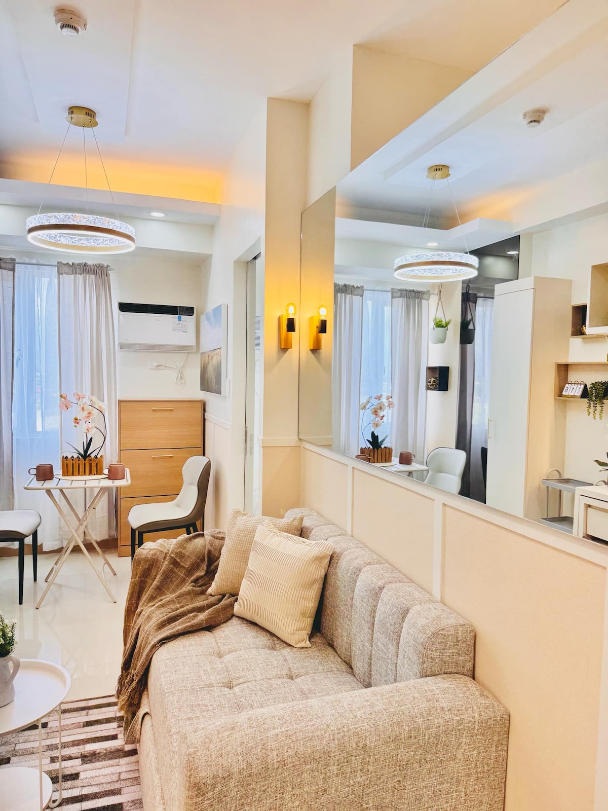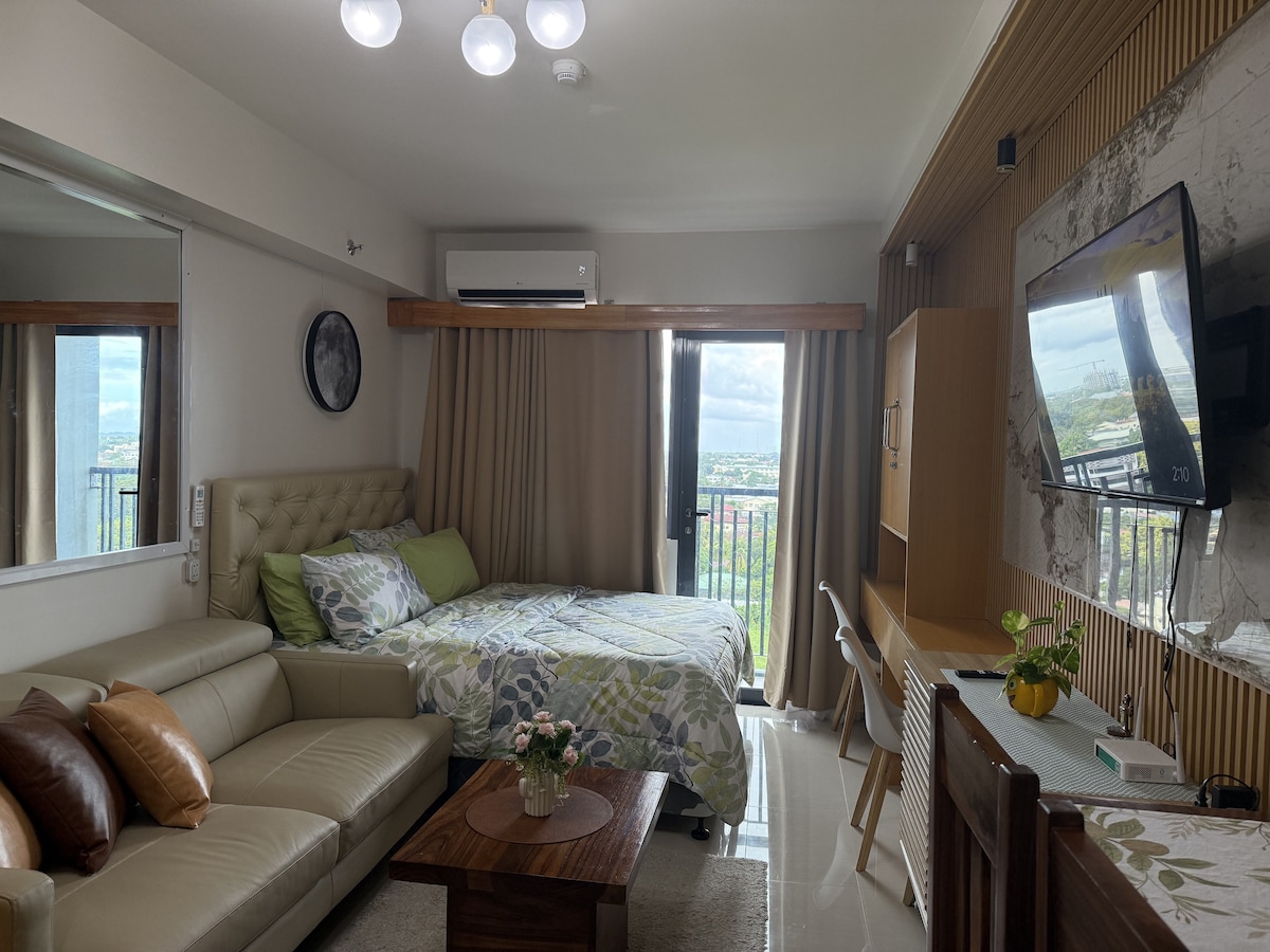 Relax and recharge in this cozy and comfortable studio apartment curated to have elements of nature to provide a sense of calm and tranquility. Located at the heart of the city, you can enjoy easy access to malls, restaurants and coffee shops. Our space offers a stylish retreat with an equipped kitchen, dining space, living area with a sofa bed that can accommodate additional guest, and a private balcony perfect for enjoying morning coffee or evening drinks.