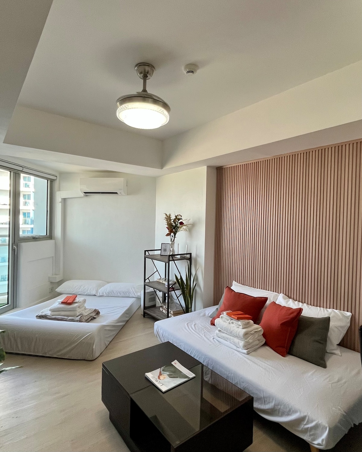 27 sqm.with Balcony Comfy uratex beds and pillows. Water heater -Newly Furnished -Free WiFI -Free Netflix - 50 inch LG smart Tv -Pool Access with PHP200 extra fee per head -Full sized double bed + pull out bed Can accommodate up to 3 guests with PHP300 extra per person after two guests.