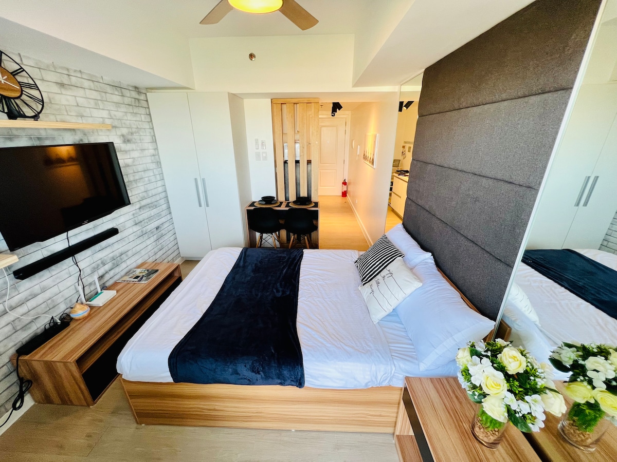 27 sqm.with Balcony Comfy uratex beds and pillows. Water heater -Newly Furnished -Free WiFI -Free Netflix - 50 inch LG smart Tv -Pool Access with PHP200 extra fee per head -Full sized double bed + pull out bed Can accommodate up to 3 guests with PHP300 extra per person after two guests.