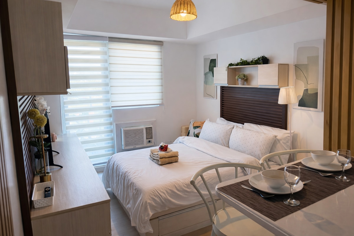 27 sqm.with Balcony Comfy uratex beds and pillows. Water heater -Newly Furnished -Free WiFI -Free Netflix - 50 inch LG smart Tv -Pool Access with PHP200 extra fee per head -Full sized double bed + pull out bed Can accommodate up to 3 guests with PHP300 extra per person after two guests.
