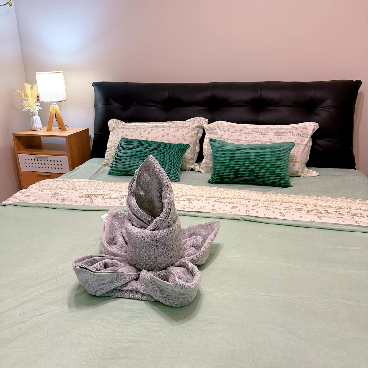 - Across SM City Mall (cinema, supermarket, dept. store, cafes, Anytime Fitness) - 2 Bedrooms with Patios, lush view. - 1 Queen Bed, 1 Full Bed - Up to 1 Extra Mattresses available upon request (Advance Notice pls) - Free Swim Pool Access for 4 Persons (P200/person for excess) (Advance Notice pls) (Pool not available on Mondays) - Pay Parking Available (P200/night. Advance Notice please) - Broadband Wifi - Kitchen - Washing Machine - Self-Check in - Check in: 3PM - Check out: 11AM