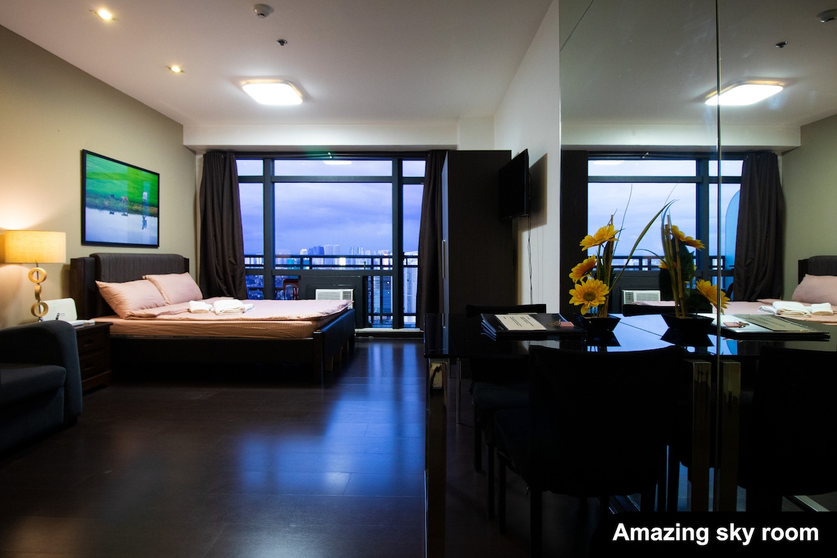 The unit is in Birch Tower, Floor 47. View is fantastic. Room is a 24sqm studio type with a balcony above 160 meters from the street. You can use the swimming pool, gym and sauna. Room has a silent split type aircon. 65" curved smart 4k TV with Netflix and other movie apps to ensure you can relax and enjoy watching your favorite movies. Its better than you expect. Security 24/7. The tower is 50 meters from Robinson Place Manila, a huge Shopping Mall. Manila Bay is 10 minutes away by walking.