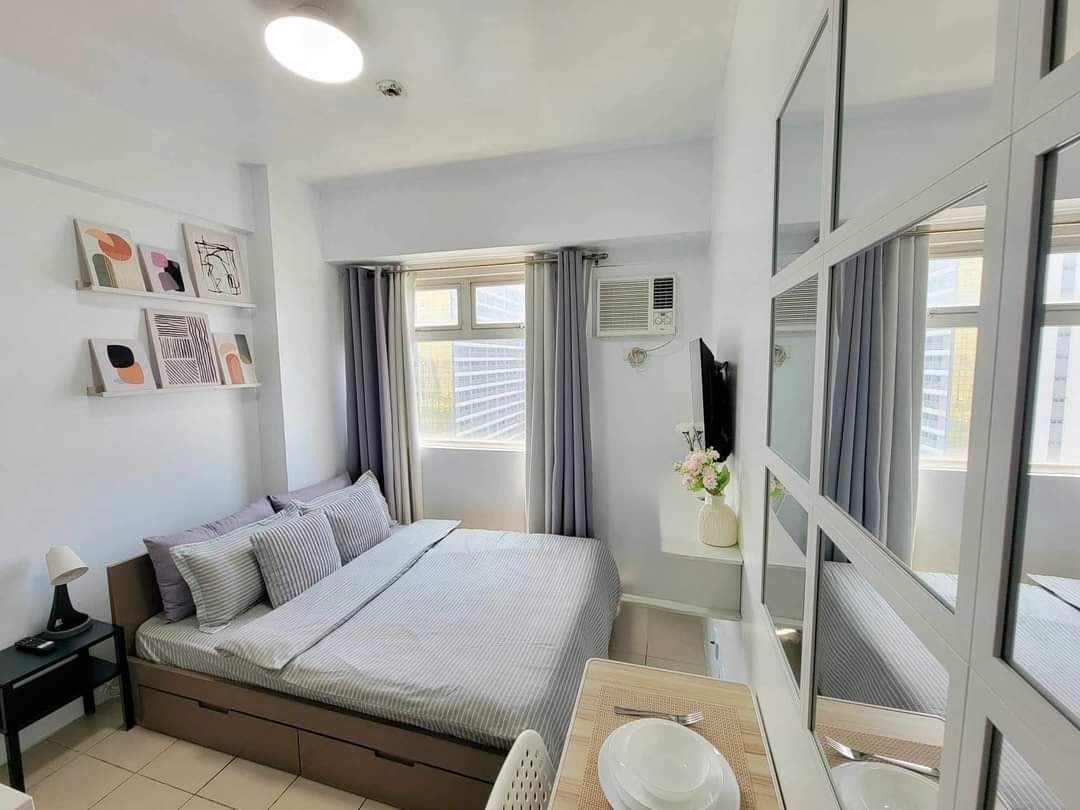 BSA Twin Towers across Megamall 1 BR unit with parking space Self check in 1 King bed 2 Sofabeds LED light fixtures all dimmable Split type AC unit Multi point water heater Rainfall showerhead, bidet, touch illuminated mirrors Vanity table with mirror Pure fiber internet postpaid Ceiling mounted TV rotates; Netflix, YouTube, local Reading materials; comics Full kitchen, fridge, microwave, induction cooker, rice cooker, water kettle, coffee maker utensils Pools, gym, playroom