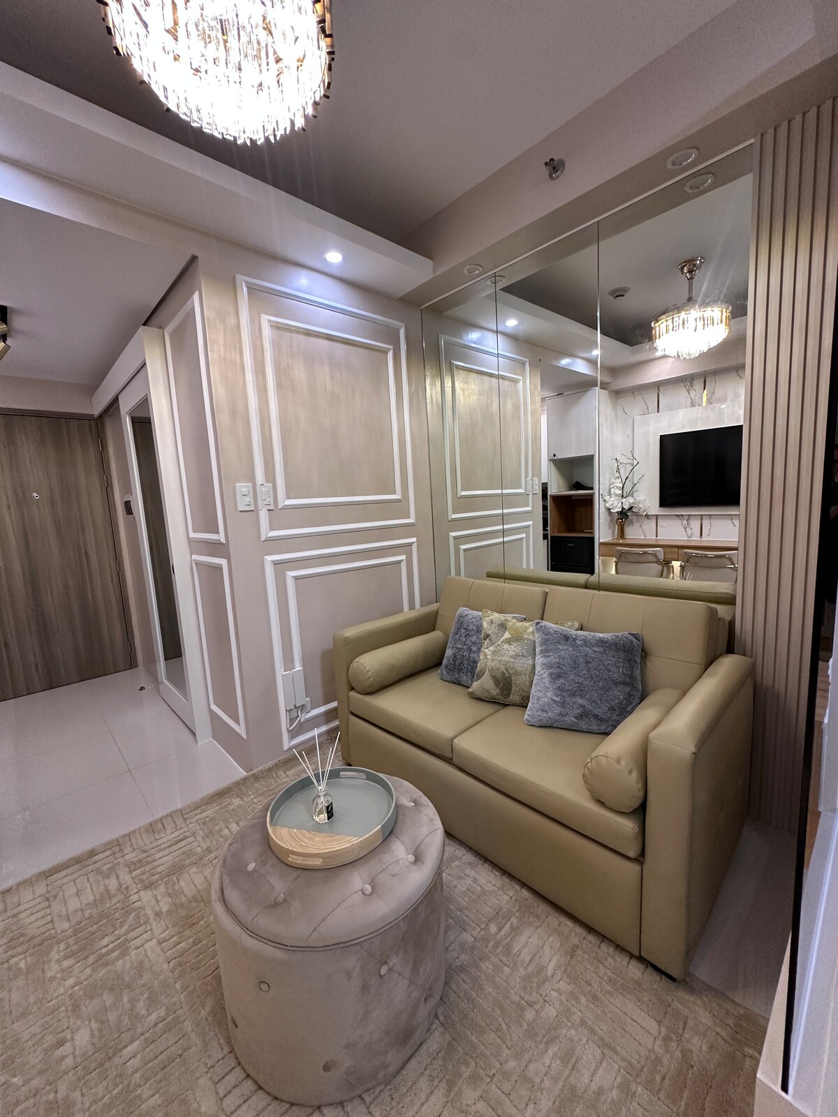 BSA Twin Towers across Megamall 1 BR unit with parking space Self check in 1 King bed 2 Sofabeds LED light fixtures all dimmable Split type AC unit Multi point water heater Rainfall showerhead, bidet, touch illuminated mirrors Vanity table with mirror Pure fiber internet postpaid Ceiling mounted TV rotates; Netflix, YouTube, local Reading materials; comics Full kitchen, fridge, microwave, induction cooker, rice cooker, water kettle, coffee maker utensils Pools, gym, playroom