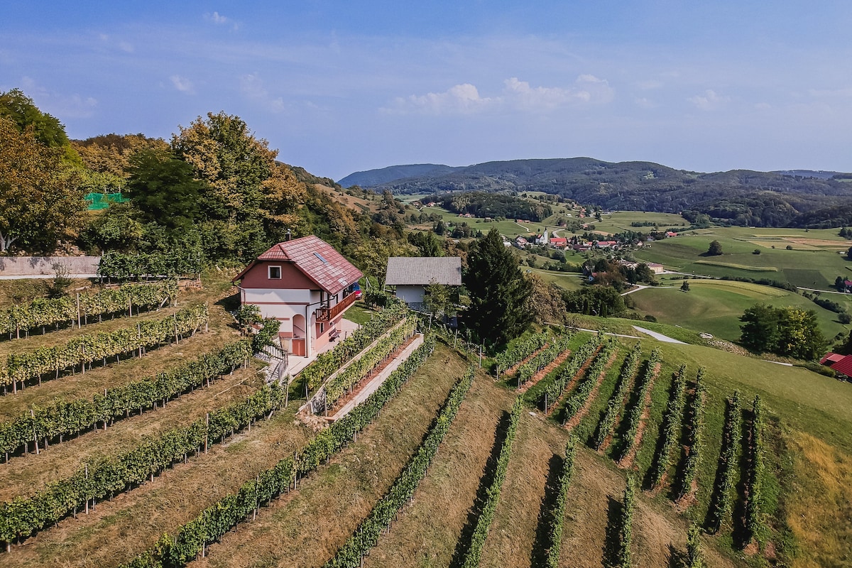Jakob's cottage is an apartment house located in the heart of Kozjansko, on a spot with an amazing view on vineyards. The cottage offers a kitchen, one bedroom with a family bed and extra bed for two persons, one bathroom and a wooden balcony with an overhang from where you can enjoy the beautiful nature and peace. The apartment offers a covered parking place, an outdoor fireplace and free Wi-Fi. It is located about 10km from Terme Olimia and is a great starting point for hikers and bicyclists.