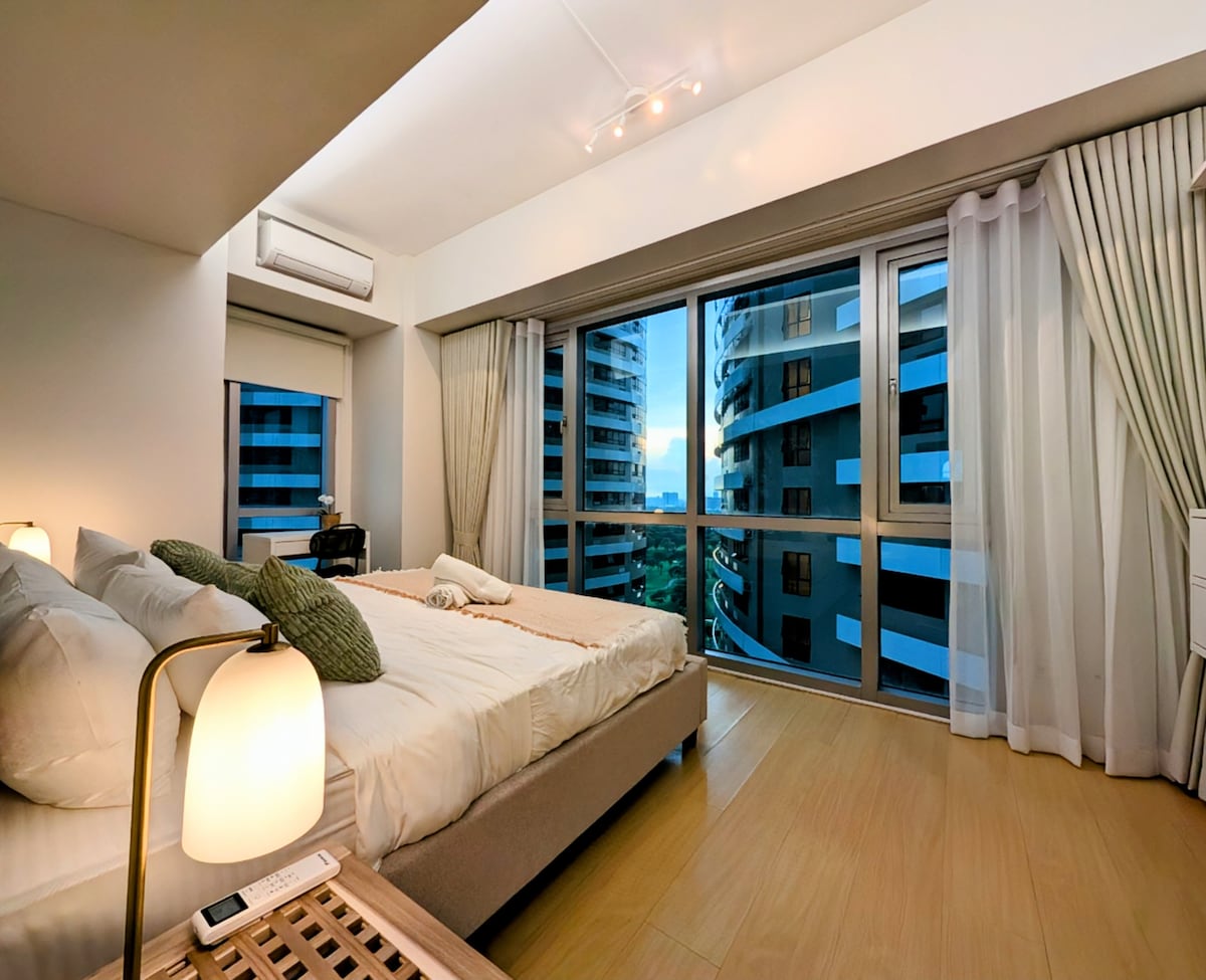 Book this luxury stay at the center of BGC. Everything is just a few steps away. Prime offices and high end malls surround Uptown Parksuites. Experience a cosmopolitan getaway at the Uptown Mall. Explore unique food and shopping concepts. Party the night away at premier bars right at your doorstep. Unwind in our Mid Century Modern bedroom unit. Relax in a queen sized bed plus an extra sofa bed. Comforts include a 50 inch SMART TV, 400 MBPS internet, study area and private balcony.