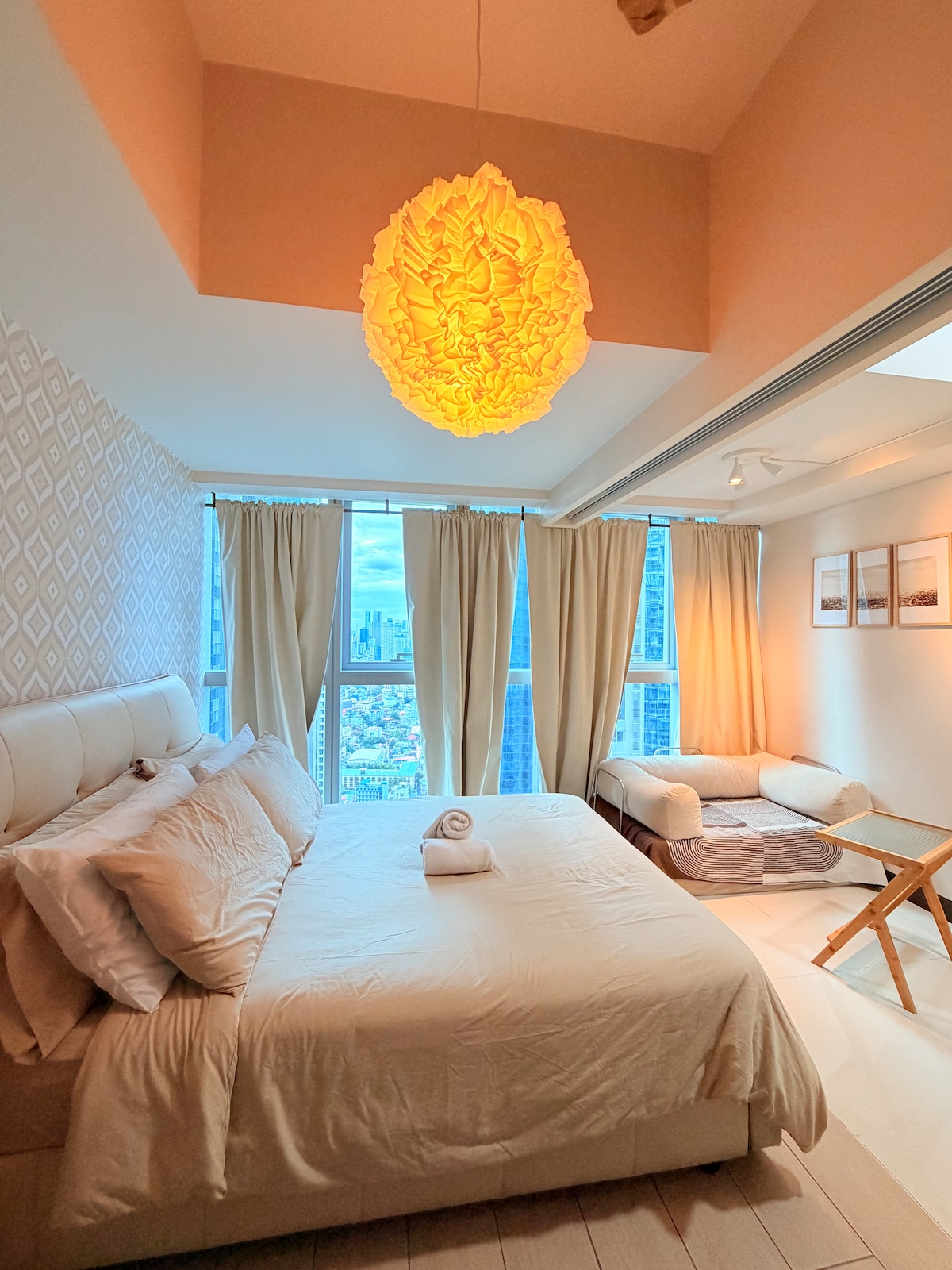 🌟 Perfect for 4 adults + kids, this stylish 1BR in Uptown Parksuites Tower 1 offers a King-Sized Main Bed and a Queen-Sized Lounge Sofa Bed with soft duvet comforters, a relaxing foot massager by the window, a full kitchen, washer–dryer, and ultra-fast 500mbps WiFi. Enjoy stunning sunset & skyline views of BGC, Grand Hyatt, and Manila 🌃 After a busy day, unwind on our cozy lounge chair or sofa while taking in the city lights ✨ Just a short minute walk to Uptown Mall, Mitsukoshi, & Landers 🥳🤍
