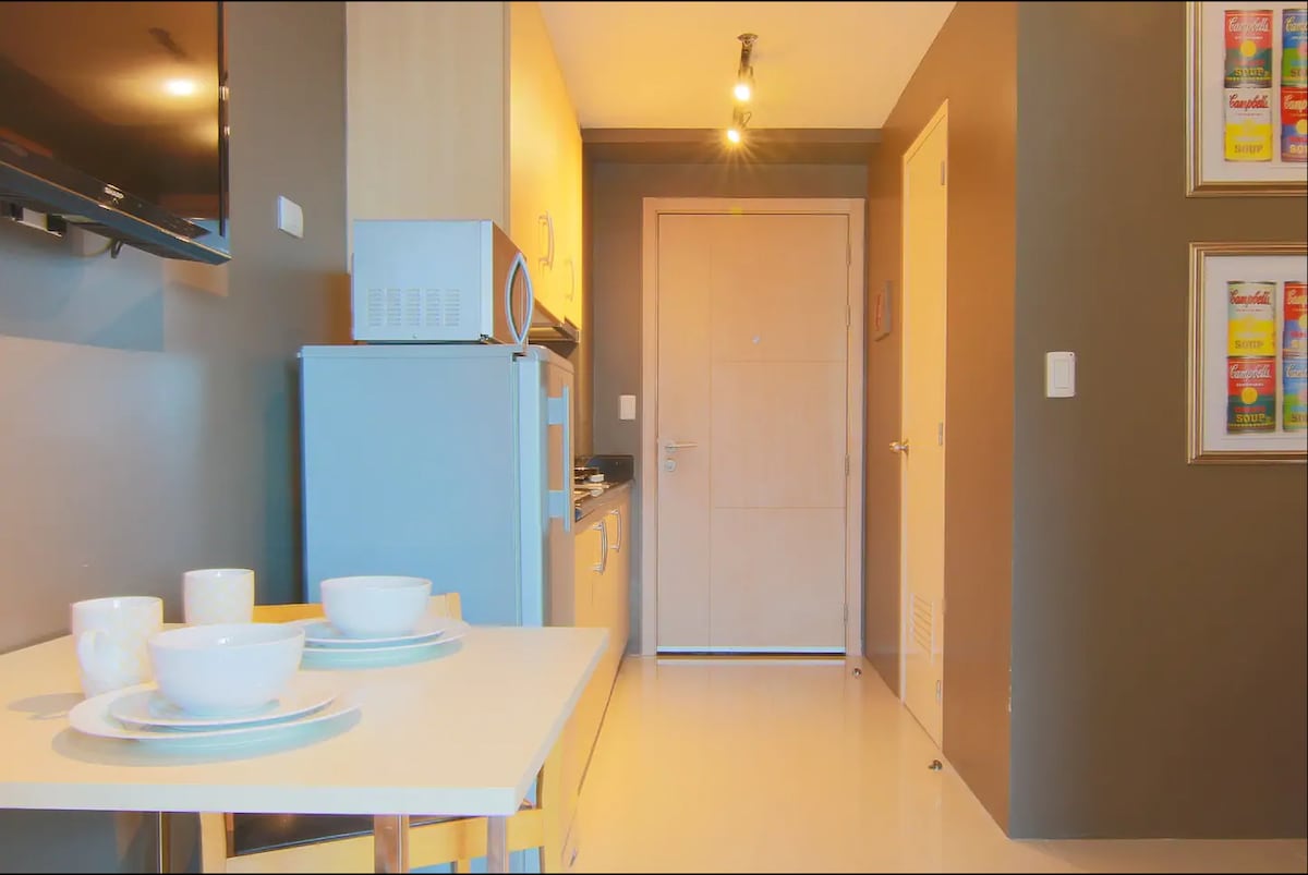 Escape to this charming succulent-themed one bedroom unit perched high in SM Light Residences Tower 1. Enjoy the convenience of mall access, blackout blinds for restful sleep, and a captivating view of the pool amenities. Whether you are working or exploring, you will enjoy the high-speed internet and landline, Smart TV (pre-loaded w/ Netflix and Disney+ subscriptions), and kitchenette, while being just moments away from the central business district. Your cozy retreat awaits!