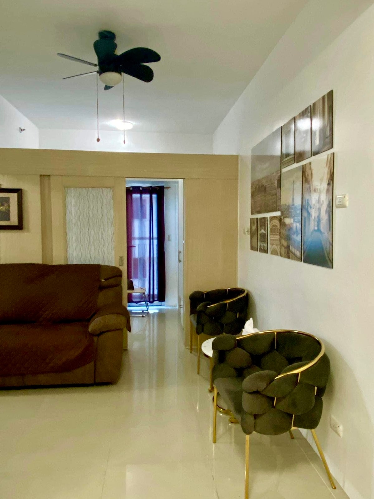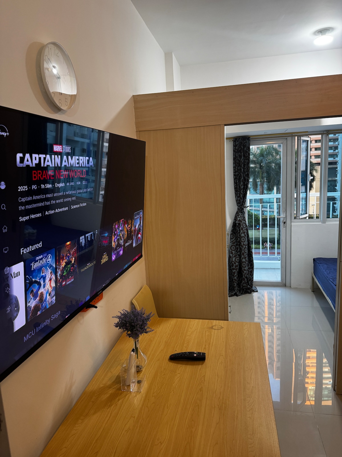 Relax in Comfort | 1BR w/ Recliner, Balcony & Pool View Welcome to your cozy retreat at SM Light Residences! This 1-bedroom unit offers the perfect balance of comfort and convenience, ideal for solo travelers, couples, or business guests. ✅ Soft recliner couch – perfect for movie nights ✅ 55” Smart TV with Disney+, Netflix & more ✅ Fridge & microwave ✅ Clean bathroom with rain shower & heater ✅ Smart digital lock – easy self-check-in ✅Enjoy a peaceful lower-floor unit with a pool view