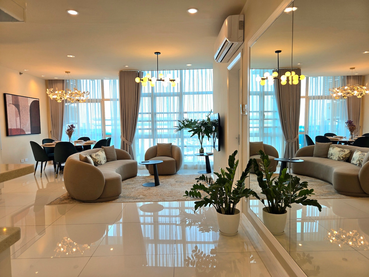 All-organic modern interiors + Crate & Barrel furnishings 78-SQM brand-new upper scale condo 180° wraparound balcony w/ Rockwell skyline views + outdoor set Queen bed w/ Tempur topper 1000 thread count linens & goose down pillows Ogawa massage chair De'Longhi coffee machine Fully stocked kitchen & coffee bar 50" Samsung TV (Netflix) + high-speed WiFi FREE welcome basket (toothbrush, slippers, shaver) Full toiletries provided 24/7 security Self check in anytime FREE access to gym, pool & parking