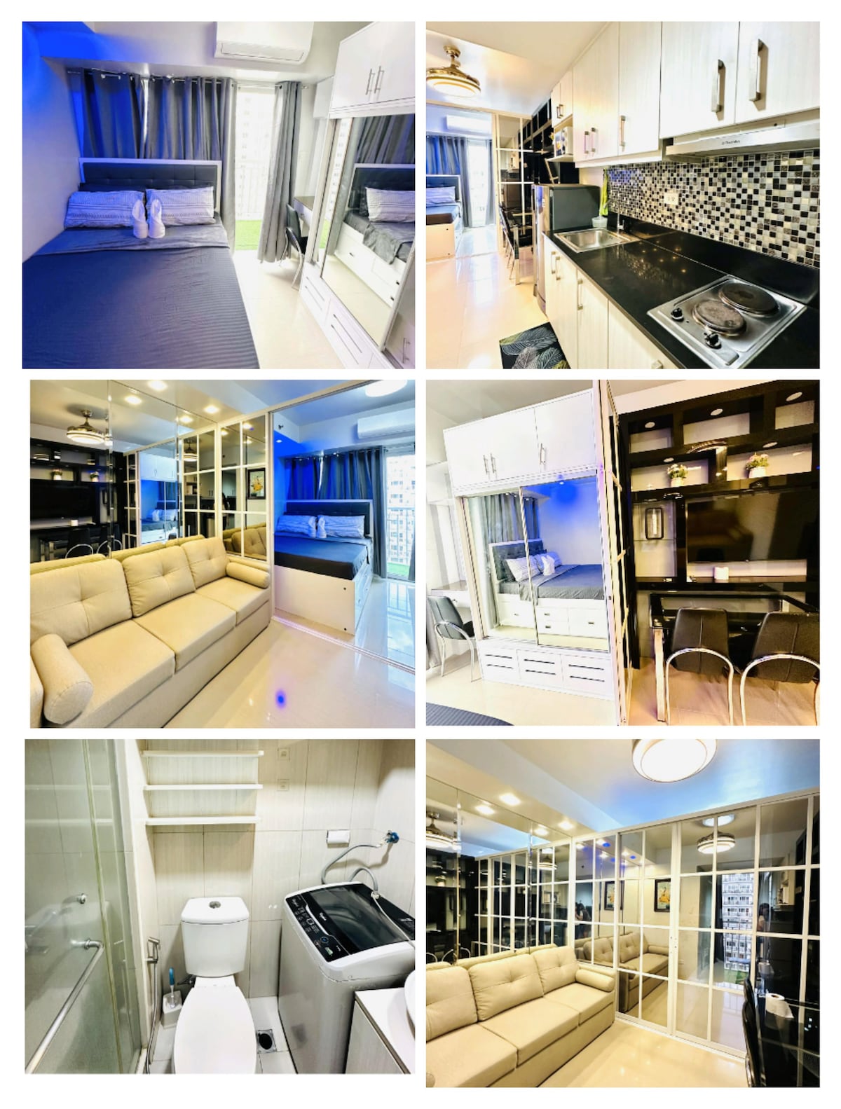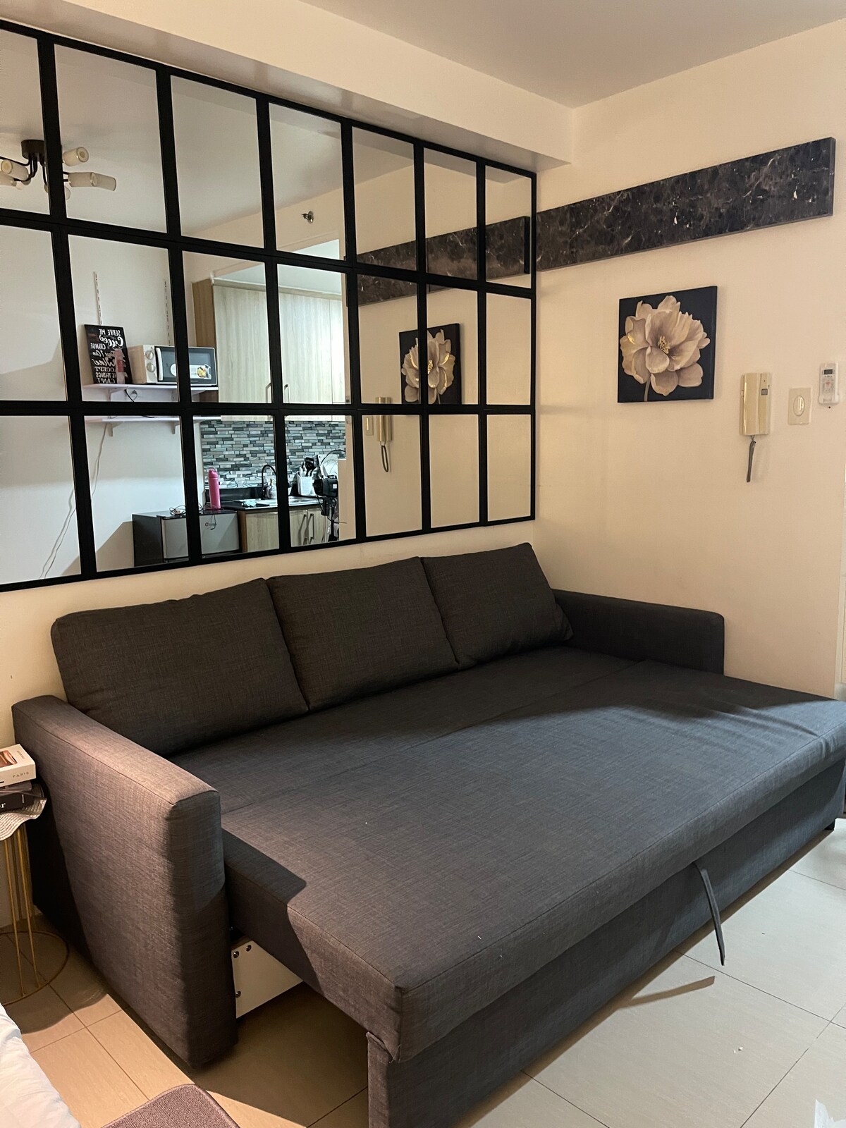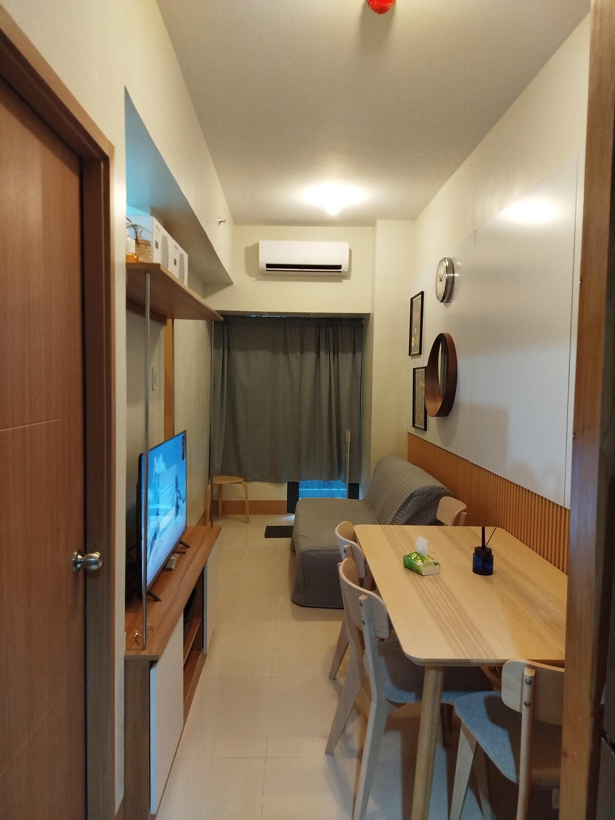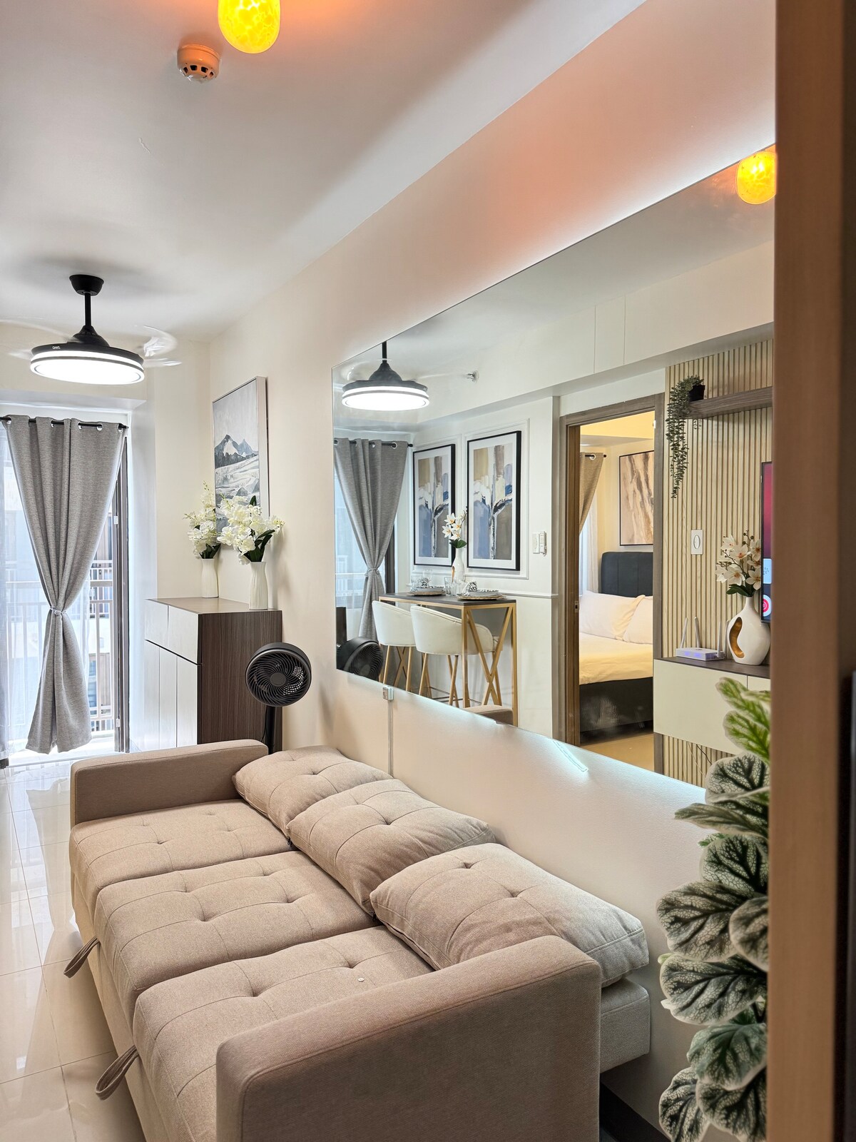 We're excited to offer you a beautiful condo unit at Shore Residence 3 Tower 4 in Pasay. This 2nd floor unit provides a serene and peaceful environment, as the building and unit are still new with fewer neighbors. The unit features a cozy one-bedroom layout with a comfortable double-size bed and a sofa bed in the living room for additional guests. Enjoy high-speed Wi-Fi, a 50' smart TV, kitchen with utensils, pots, refrigerator, coffee maker, and more amenities to make your stay enjoyable.