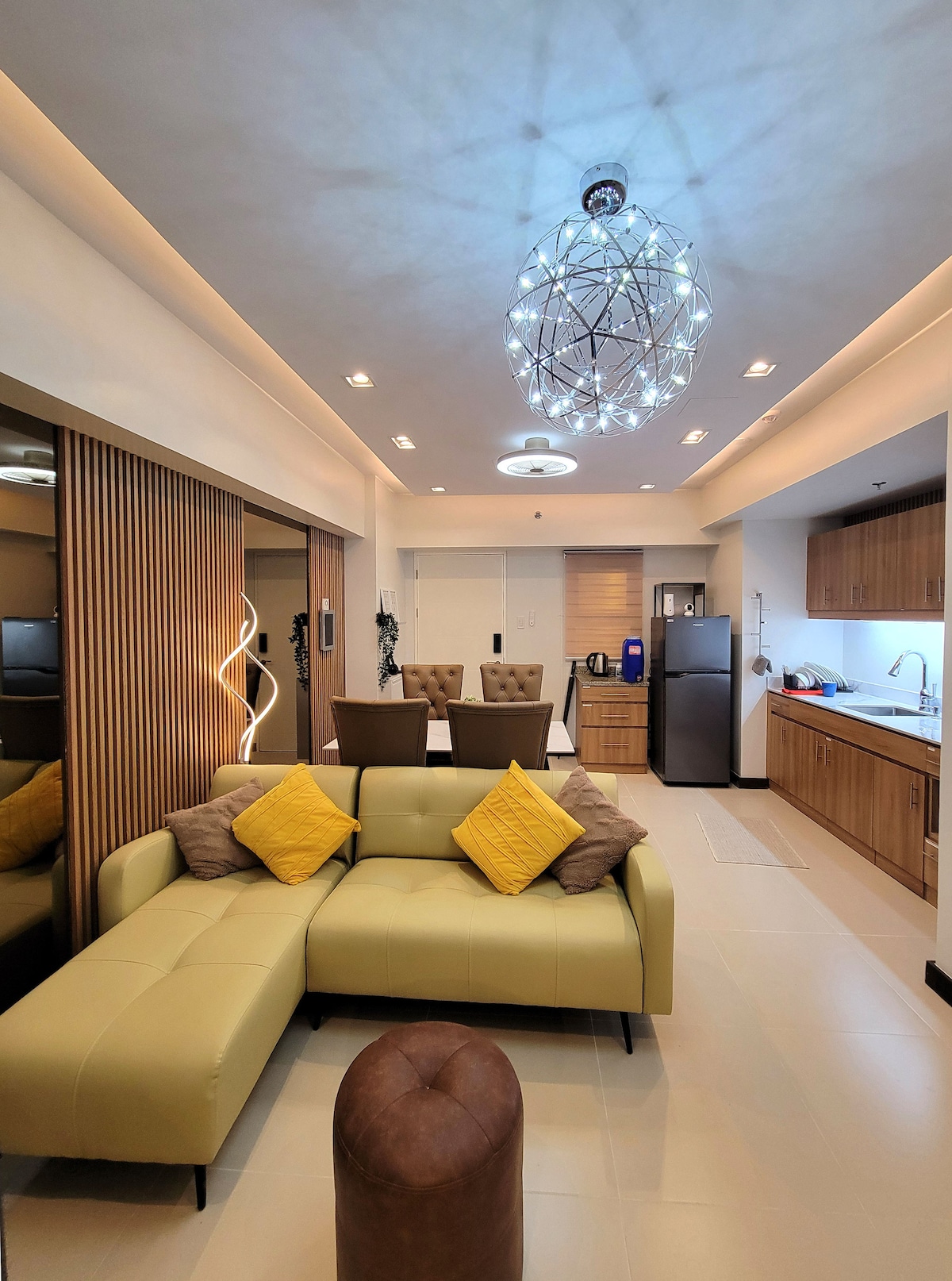 Experience modern luxury in this chic, light-filled studio. Perfectly optimized for comfort, it features a plush full double size bed, a cozy sofa, and a sleek workspace under a 55" 4K TV. It's right across SM Southmall for your dining, shopping, and entertainment needs. Highlights: Elegant Design: Stunning crystal chandeliers with fan and gold accents. Fully Equipped: Compact kitchen with microwave, fridge, and stovetop. Premium Comfort: Mirrored cabinet doors, blackout curtains, and AC.