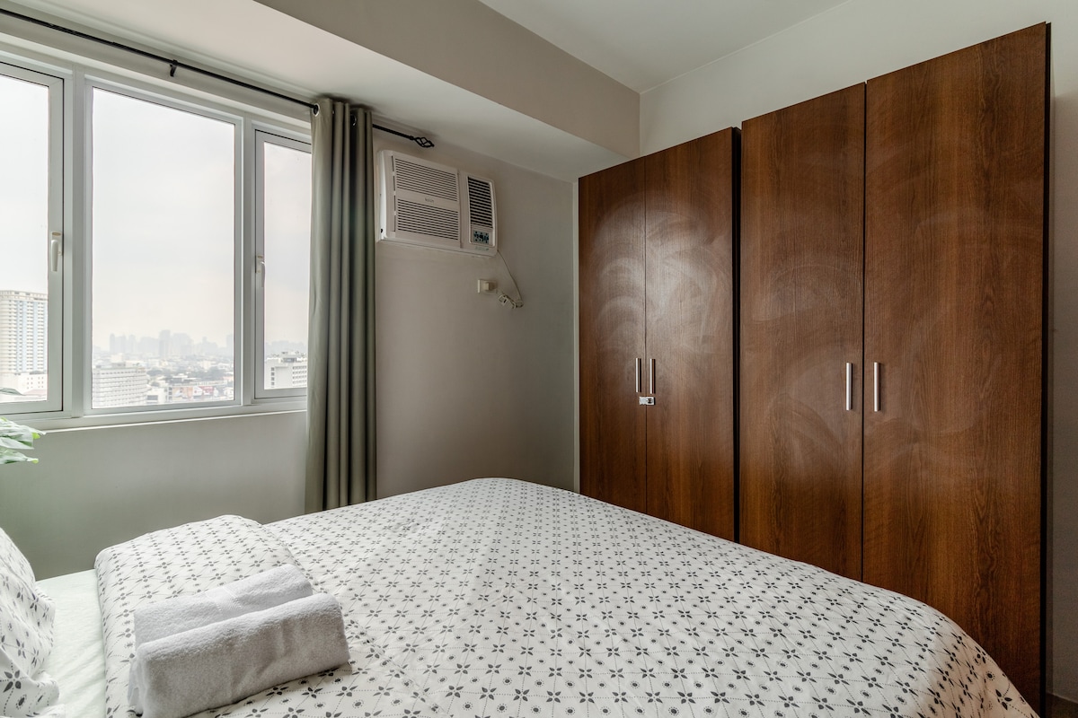 At Sun Residences Condominium, we have a brand-new 1-bedroom w/ terrace unit, with a custom-made interior design. It comes with all of the necessities for a pleasant stay. The Manila University Belt, hospitals such as UDMC and Saint Luke's, and public transportation are also close by. Couples, explorers, and business travelers will all enjoy it.