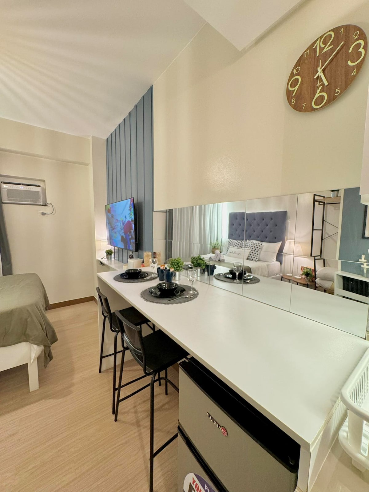 The place is nice and quiet close to the store and mall’s easy access and very convenient place to couple and group to stay. Inclusion ✔Queenbed with pullout bed ✔Pullout Sofa bed ✔55" Smart TV ✔Air-conditioned ✔Infrared Stove ✔Refrigerator ✔Rice Cooker ✔Kettle ✔Microwave ✔Kitchenware ✔Internet ✔Rain shower with Heater ✔Bath towels ✔Tissue ✔️Hair blower ✔️Clothe steamer ✔️Mini videoke ✔️Pay Parking