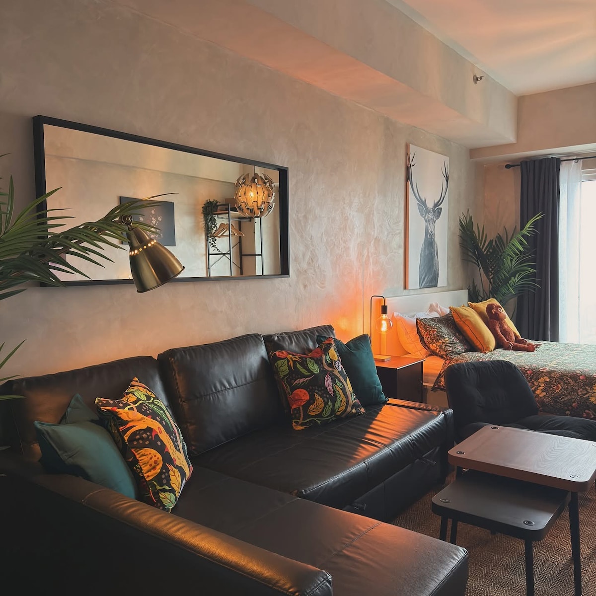 A comfy and stylish place to stay with a vintage and modern ambience. It allows you to have the convenience of having a private parking right at the basement of the same tower where the unit is located. Definitely ideal for a group of 4 given a queen bed, a queen sofa bed and a floor mattress. The place also allows you to cook as your family enjoy the amenities of the condo with the very pleasant weather of Tagaytay.