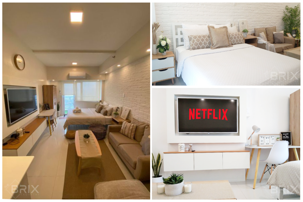 A lovely space to unwind and relax after a busy day at work. Indulge in the comfort and tranquility of this contemporary 1 bedroom condo unit. The apartment has a monochromatic color scheme with tempered glass partition and wood surfaces. Enjoy Netflix in a comfortable sofa or spend some time at the balcony to enjoy the cool breeze and cozy weather in Tagaytay. You can also spend some time admiring the breathtaking panoramic view of Taal Lake in the Sky Lounge that guests can access.