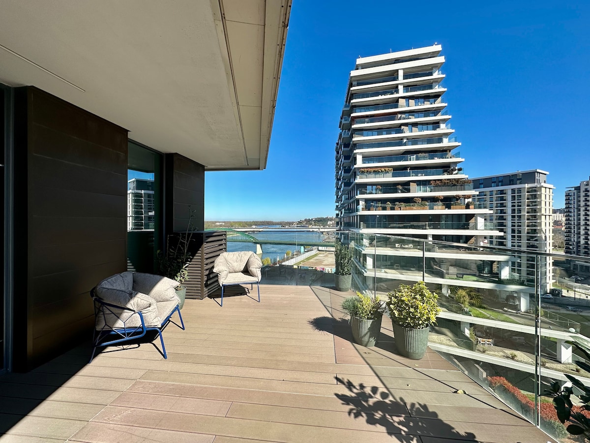 This spacious apartment in the heart of Belgrade Waterfront perfect for romantic getaway is waiting for you ! Apt has 2 large bedrooms, 2 full bathrooms, open kitchen, dining and living area, it includes cable TV and internet. This condo has large west facing terrace with views of the Sava and Dunav Rivers ,views of 3 bridges, the Kalemegdan fortress, and most beautiful sunsets. It is in one of the newest and most desirable luxury buildings on the newly developed Belgrade waterfront.