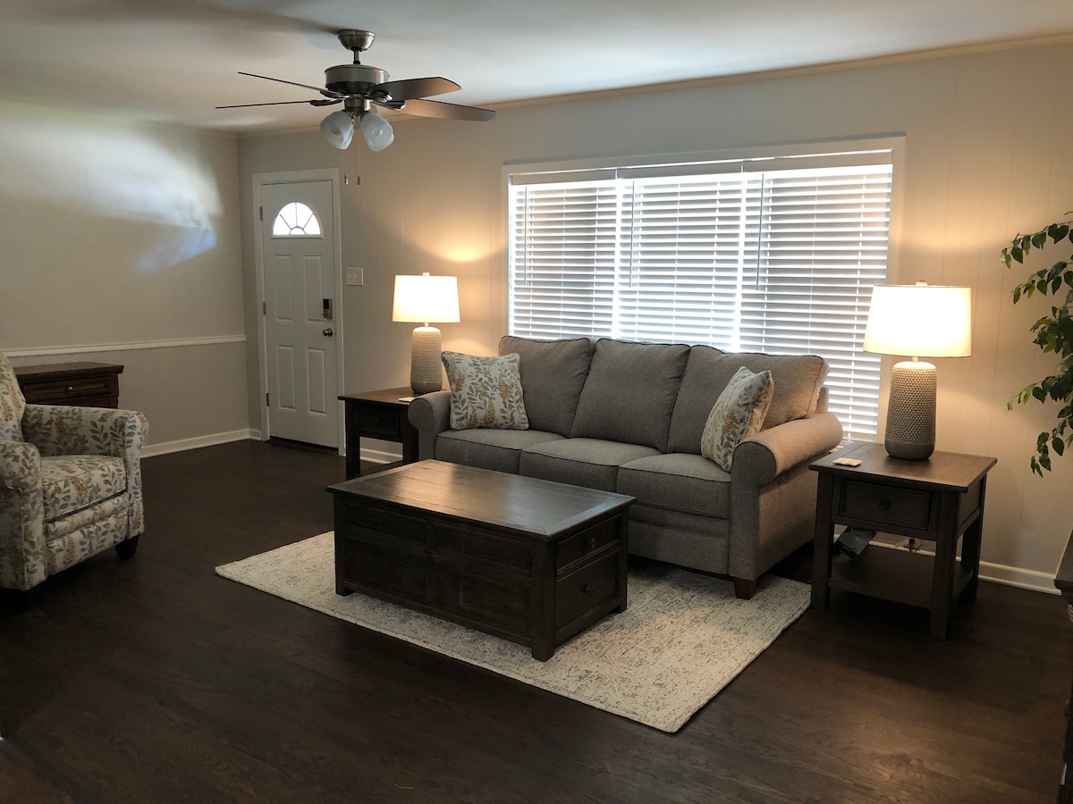 Warm and inviting! This home has 3 separate bedrooms for rent. The featured king room offers all new furnishings including bed, super comfy mattress, nightstand, 5 drawer chest, chair, table, lamp, alarm clock, paper/pen, power strip with USB ports and lap desk for work! Closet has shelf, hangers & luggage rack. House Amenities: 70" TV in living, Wifi, washer/dryer/iron/board/pots/pans/dishes/fully stocked coffee bar/breakfast items/hand & body soaps/shamp & cond/hair dryer/cleaners.