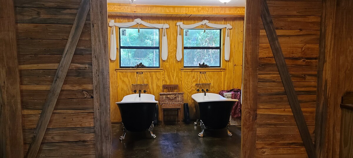A private wooded loghouse retreat designed for a relaxed, effortless stay. Enjoy a wood-fired soaking tub under the trees and a quiet East Texas escape. Complimentary firewood for both the soaking tub and fire pit, along with a curated welcome board, are prepared for your arrival. Split firewood for the wood-fired soaking tub is provided, along with additional logs for the fire pit. Everything you need to enjoy the experience is ready for you — no extra fees or add-ons required.