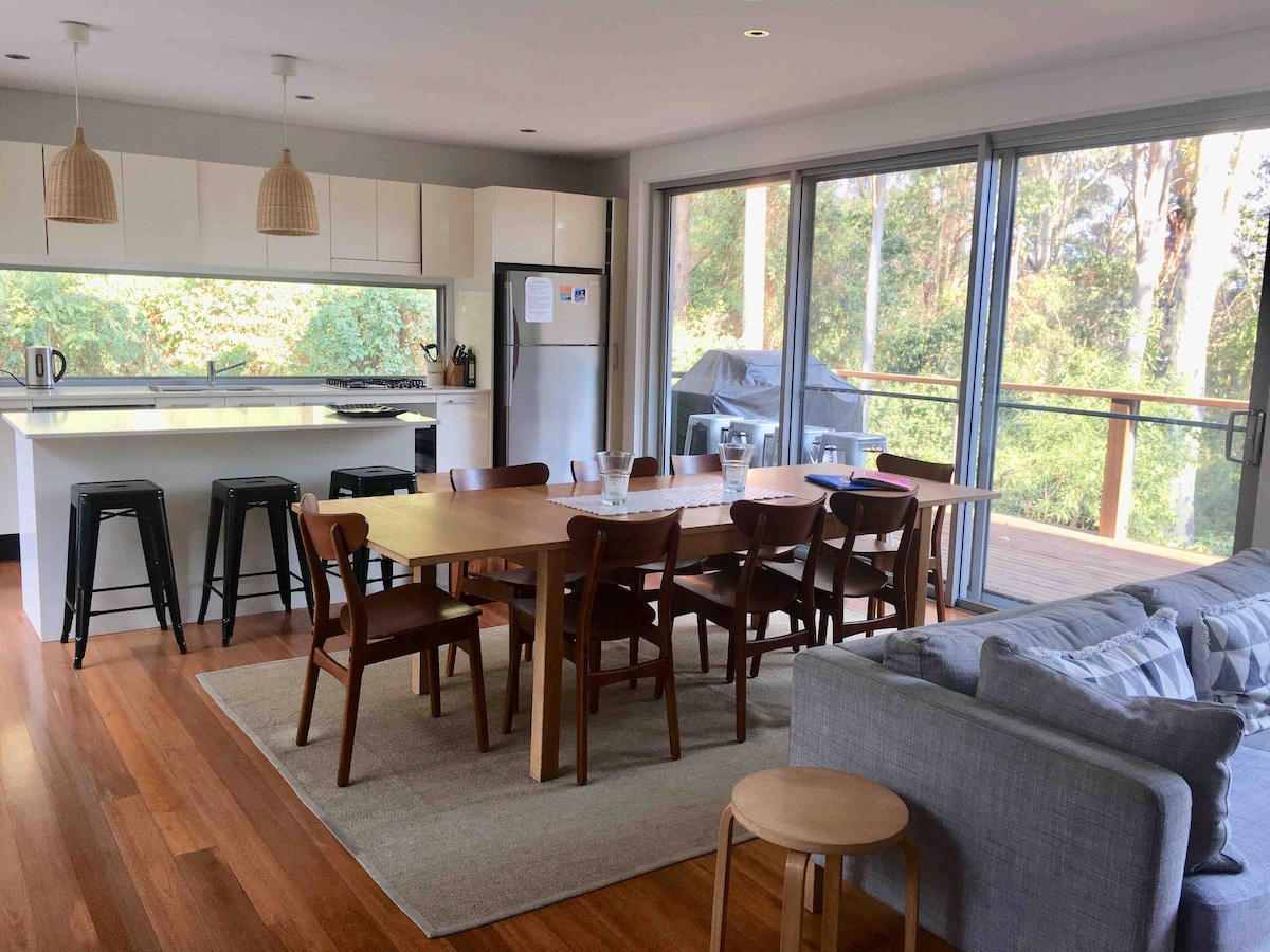 We are back after renovations! Air Conditioned upstairs and down, with free WiFi and complimentary bottle of wine on arrival Beautifully appointed, big, modern, clean house backing onto rainforest with your own private hot tub and fire pit, outdoor lounge and hammocks. Plenty of space inside and out with 4 bedrooms, 3 bathrooms, 2 living areas, 2 dining areas, 3 lounge areas and 2 wrap-around decks. 5 minute walk to the lake. Note: This is NOT a party house. Noise rules apply
