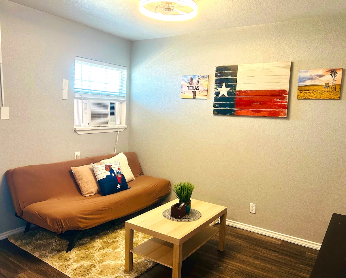 Welcome to our Adorable Texas Guesthouse! This newly renovated 1 bed, 1 bath casita is fully fenced and nestled in the backyard of our main house, offering privacy, charm, and comfort. Enjoy a queen bed, walk-in shower, high-speed WiFi, smart TV, and a cozy living area with dedicated workspace. The kitchenette features a full-sized fridge and ample storage. With private parking and keypad entry, plus relaxing outdoor seating, this cozy retreat is the perfect home base for your Texas stay.