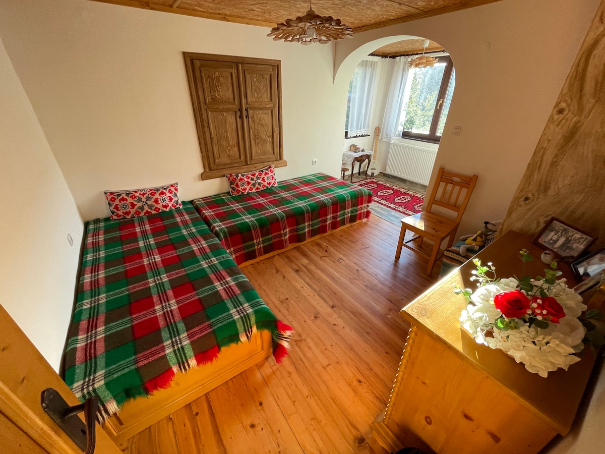 Experience the magic of Rhodopean mountains. We offer you a beautiful panoramic room with private bathroom and balcony with mountain view. The room is in a guest house called "Milka", and the house has more rooms which you can see here on Airbnb. There is a shared kitchen guests can use. Our guests can enjoy the mountain view while relaxing in a hot tub. The hot tub is paid additionally and costs 30 BGN/hour and can fit 5 people. At the house you can order traditional breakfast and dinner.