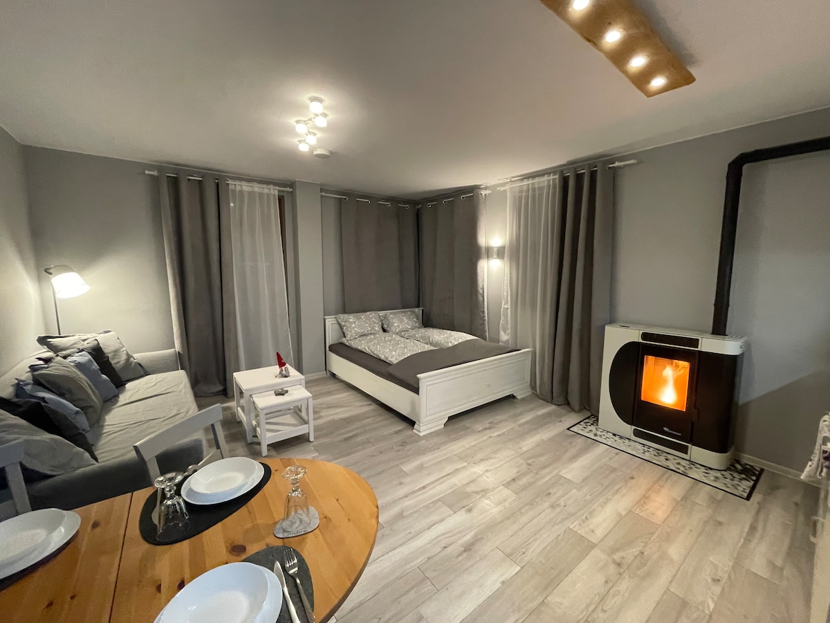 Грижливо, практично и дизайнерски обзаведено, студиото разполага с всичко необходимо за пълноценна почивка-ергономичен антистрес матрак, ортопедични или високи възглавници, леки завивки, романтична камина, съвременни уреди, напълно обзаведена кухня с маса за хранене, удобен диван, който се превръща в легло, просторна баня, високоскоростен Интернет и гледка към борови гори от балкона! Намира се на първи (не партерен) етаж и има собствен изход към градината! Паркингът е точно до входа на сградата.