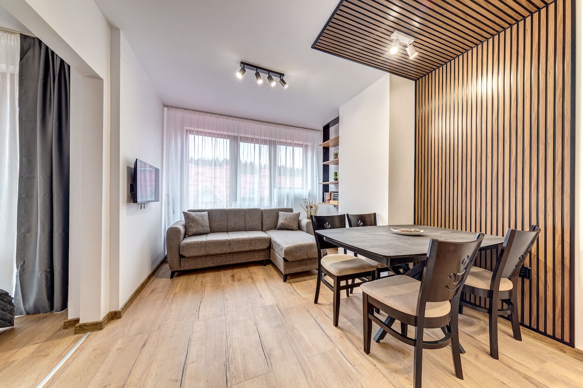 Welcome to our cozy 1BD flat in Pamporovo, where comfort meets the thrill of the slopes. There is a fully equipped kitchen and an inviting bedroom that ensures a restful night's sleep. In the common room, there is an extendable couch where you can rest or enjoy the breathtaking view of the ski slopes right outside your window. This space offers the perfect blend of convenience and serenity. Embrace the warmth of our space after a day on the slopes and make memories in this mountain haven.