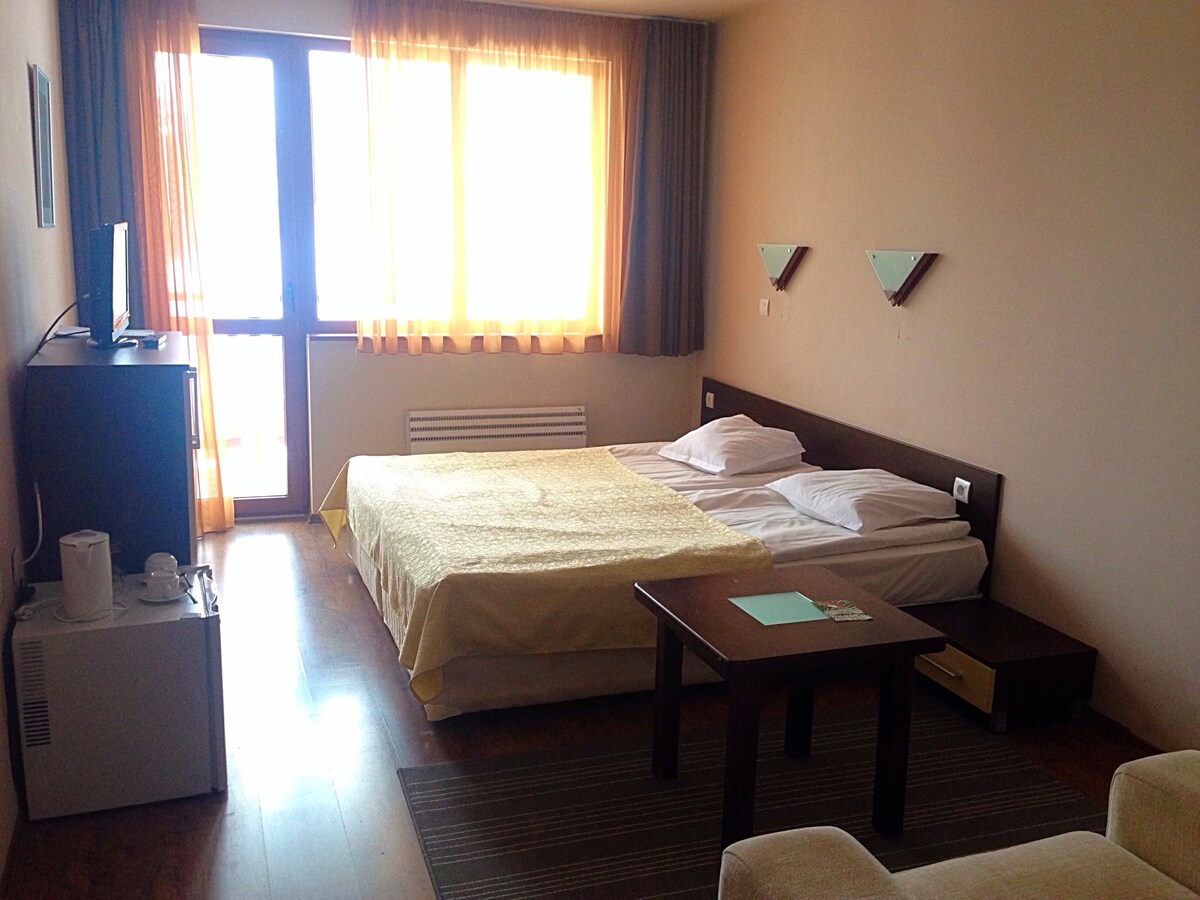 IT'S TIME TO GET COSY with our comfy and quiet 2 bedrooms apartment, SKI-TO- THE DOOR - 50m away from the ski lift Studenetz! You can enjoy winter next to the fireplace. Access to a full equipped kitchen and a balcony with a splendid mountain view. Couples, solo adventurers, and families are welcome! All in one complex : supermarket Aliaska,SPA center (price liste on the lobby bar), restaurants, lobby bar, tavern and bowling. Wish you an excellent stay in Rhodope Mountains!