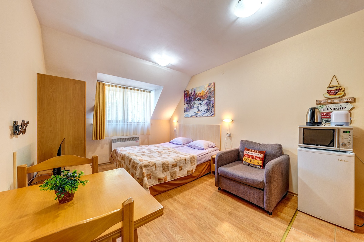 Грижливо, практично и дизайнерски обзаведено, студиото разполага с всичко необходимо за пълноценна почивка-ергономичен антистрес матрак, ортопедични или високи възглавници, леки завивки, романтична камина, съвременни уреди, напълно обзаведена кухня с маса за хранене, удобен диван, който се превръща в легло, просторна баня, високоскоростен Интернет и гледка към борови гори от балкона! Намира се на първи (не партерен) етаж и има собствен изход към градината! Паркингът е точно до входа на сградата.