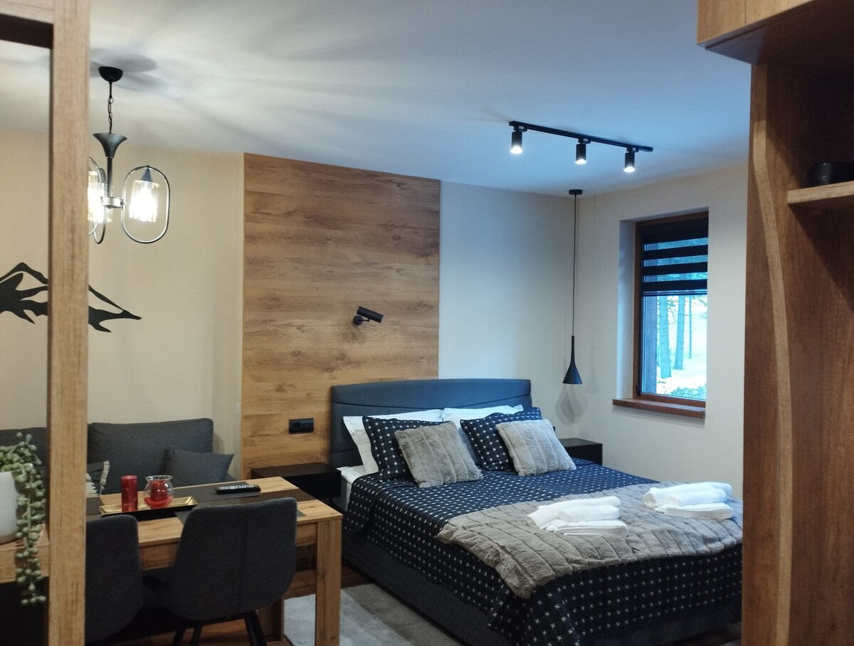 Грижливо, практично и дизайнерски обзаведено, студиото разполага с всичко необходимо за пълноценна почивка-ергономичен антистрес матрак, ортопедични или високи възглавници, леки завивки, романтична камина, съвременни уреди, напълно обзаведена кухня с маса за хранене, удобен диван, който се превръща в легло, просторна баня, високоскоростен Интернет и гледка към борови гори от балкона! Намира се на първи (не партерен) етаж и има собствен изход към градината! Паркингът е точно до входа на сградата.