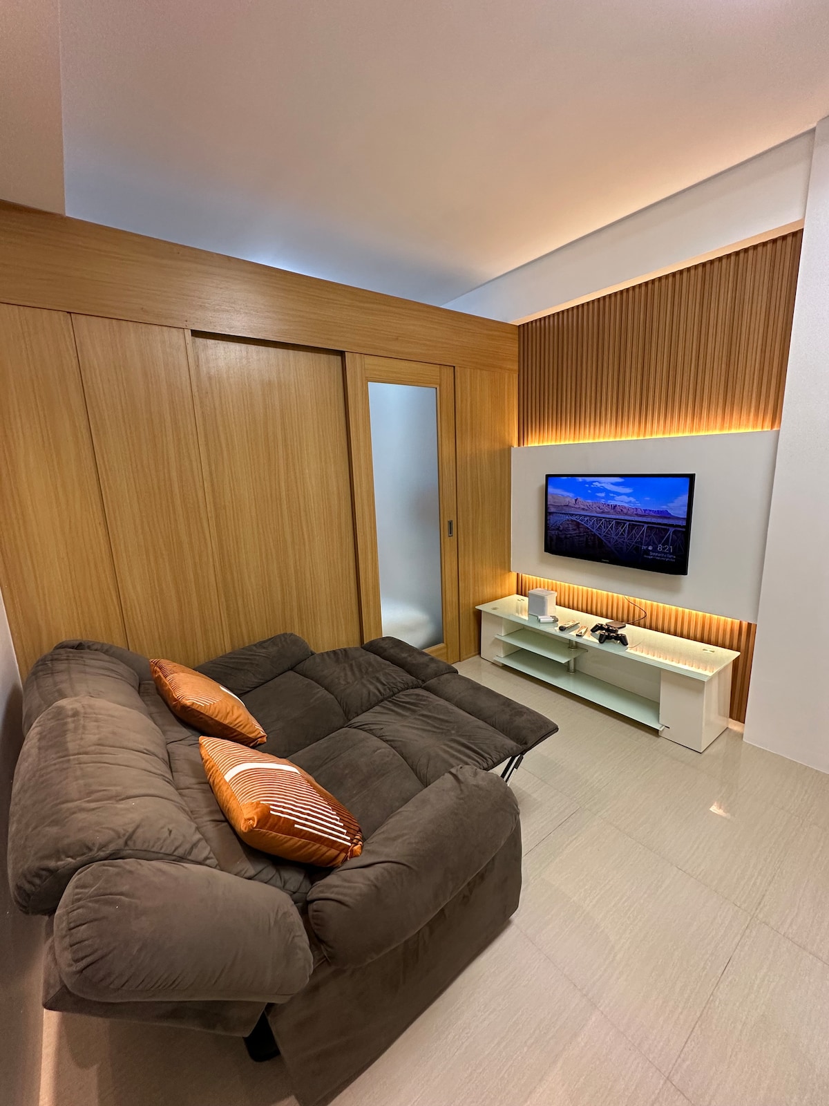 Large 32sm 1 BR-15F Shore 3 Twr 3 near MOA. High Spd fiber WiFi. Enjoy Karaoke, Netflix, YouTube, & more on the 55” QLED 4K TV w/sound bar. Full kitchen w/RO, hot & cold drinking water, cook top, microwave, pots & dishes. Hot shower w/body wash & shampoo. BR has Queen sized bed w/ thick, comfy mattress. LR has a ceiling fan & sofa converts into a double bed. Balcony with views of MOA & weekend fireworks. Walkable to MOA. Close to airport, SM Arena, SMX, Manila Bay, casinos, restaurants & more
