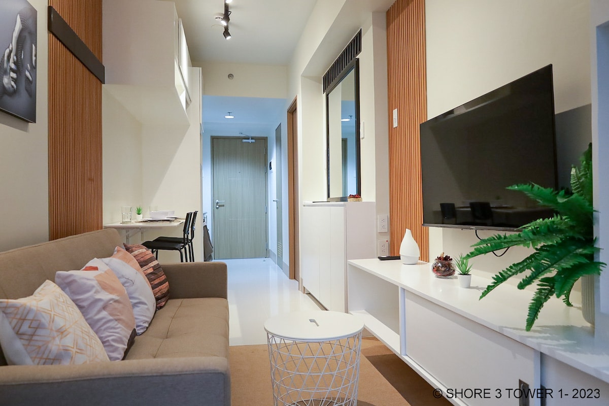 🏃♀️Closest Condo to MOA (8-Min Walk) ❤️Quality stay w/ experienced hosts 😻27 sqm (290 sq ft) space (including balcony) 🛏️ Premium hotel-quality bed & linens for a restful sleep 🛁 Plush towels & essential toiletries 🧺 In-unit washer & dryer 🍽️ Complete Kitchen & cooking essentials 📺 Smart TV, reliable 100 mbps Wi-Fi, air conditioner 🏊♂️ Access to swimming pools 🛌 Accommodates 2 guests. 3 guests tight. 1 Premium Full Double-sized bed (54×75 inches) 1 single-sized Sofa bed