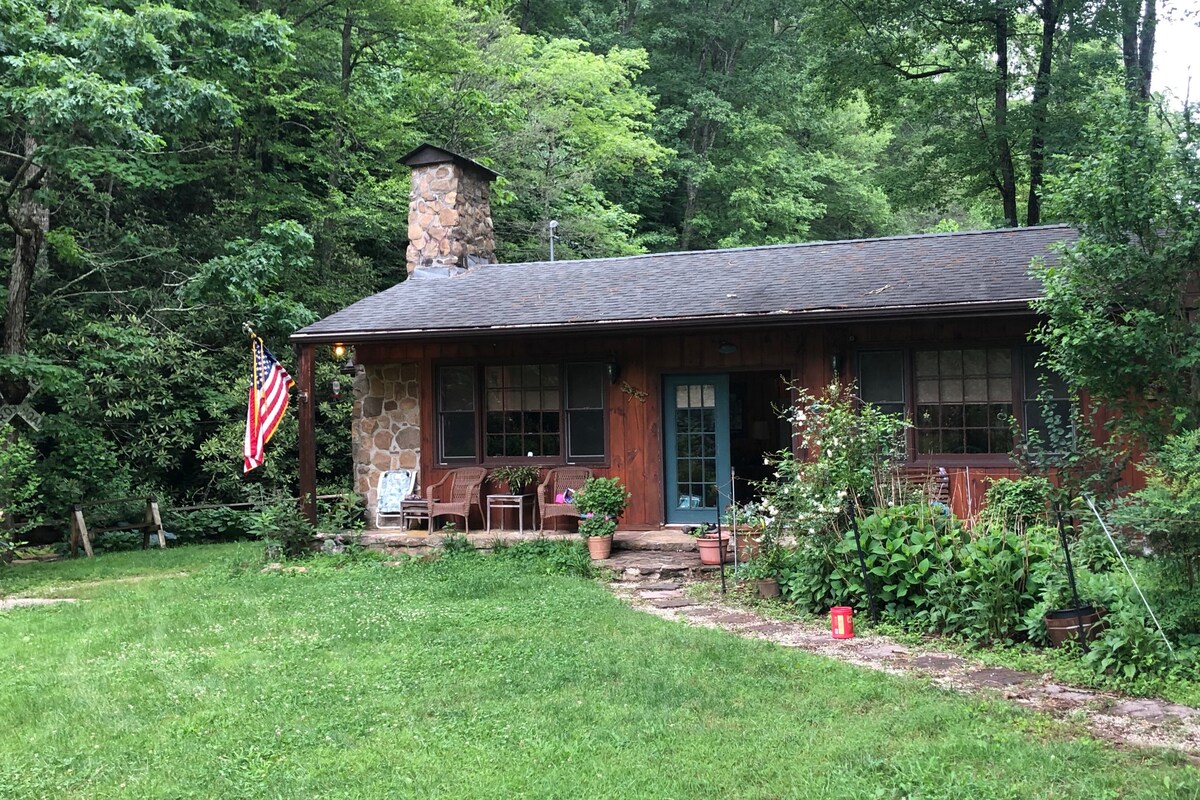 Now high-speed internet! On 6 wooded acres in a private mountain river cove outside Damascus, VA , our cozy, renovated 3-story A-frame cottage property fronts the cliff-flanked, trout-stocked South Fork Holston River. The cottage features 3 spacious bedrooms, each on its own level; a fully equipped kitchen; great room; dining room; laundry room; and a 2nd-floor loft accessing the 16'-wide balcony. A 20' x 12' deck offers space for outdoor relaxing and dining and opens to the yard with fire pit.